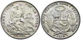 Peru. 1 sol. 1934. Lima. (Km-218.2). Ag. 25,18 g. Soft tone. Original luster. AU/Almost MS. Est...50,00.