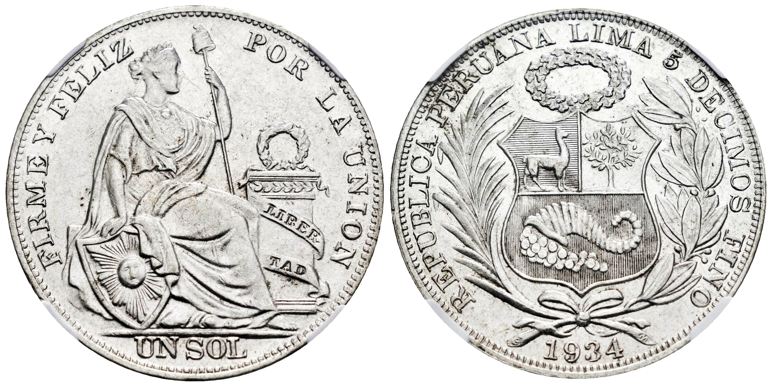 Peru. 1 sol. 1934. Lima. (Km-218.02). Ag. Slabbed by NGC as AU 58. Traces of luster. Est...60,00.