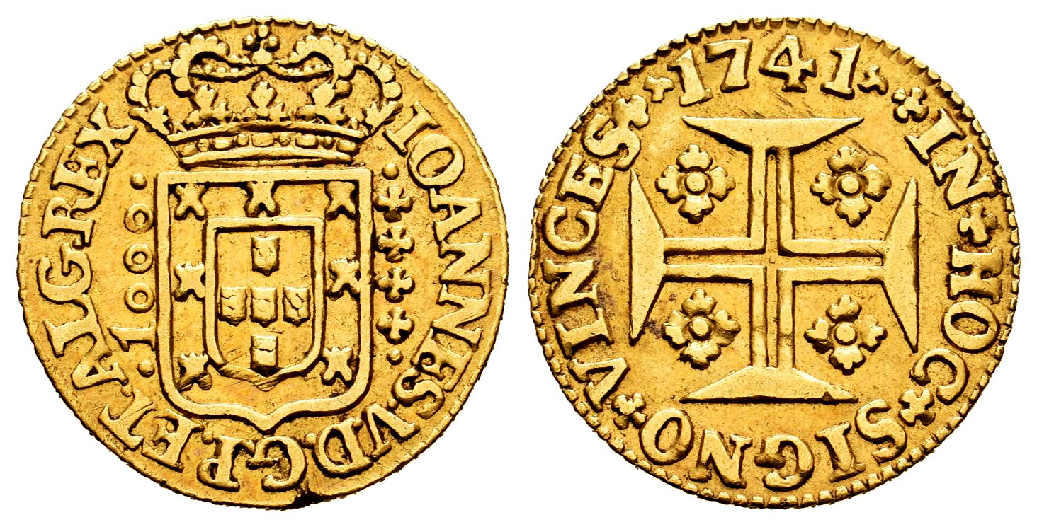 Portugal. D. Joao V (1706-1750). 1000 Reis. 1741. Lisbon. (Gomes-88.24). (Km-182). Au. 2,34 g. Minor nick on edge. Choice VF. Est...0,00.