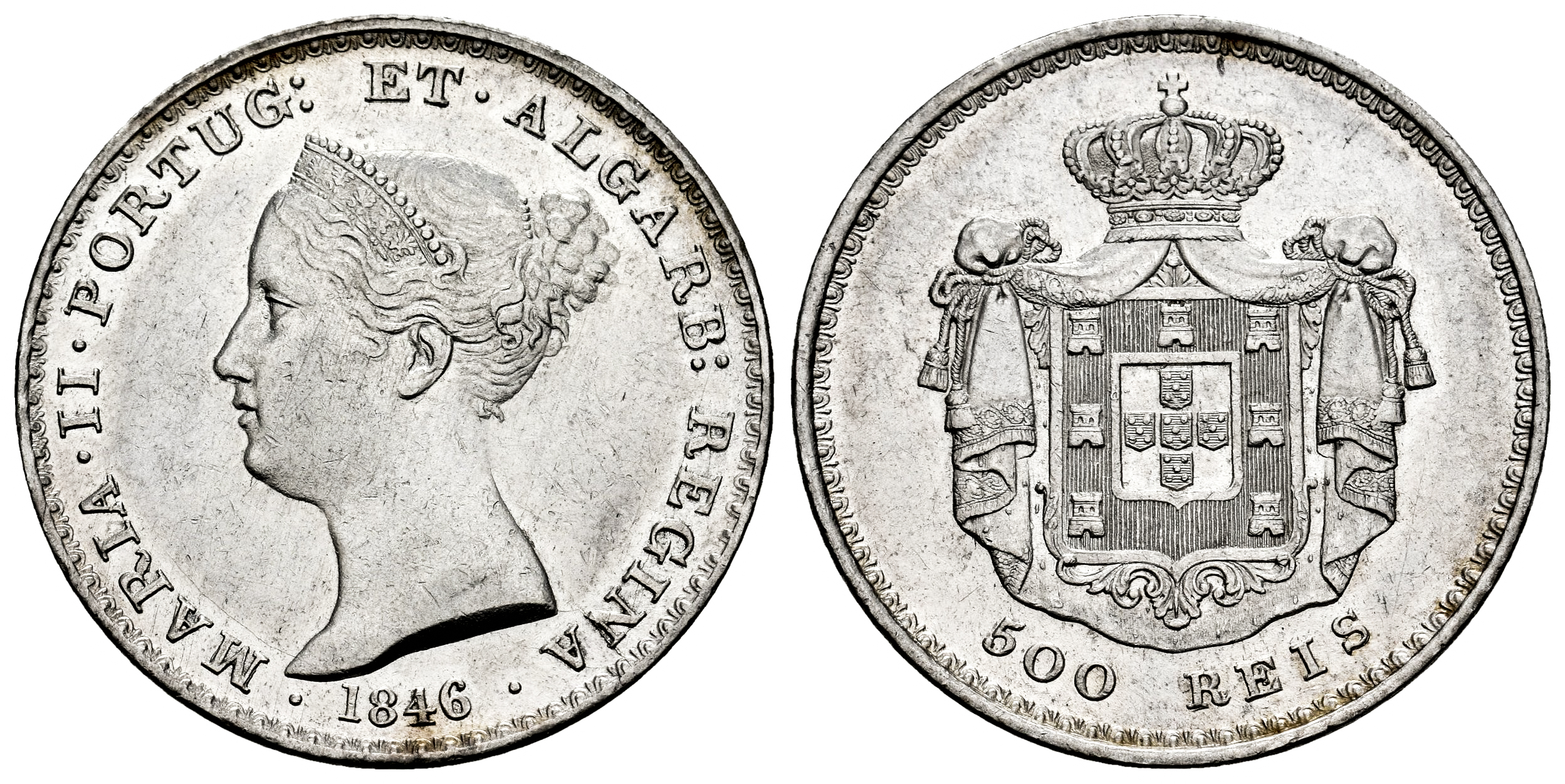 Portugal. D. Maria II (1834-1853). 500 reis. 1846. (Km-471). (Gomes-39.11). Ag. 14,79 g. Traces of luster. XF. Est...100,00.