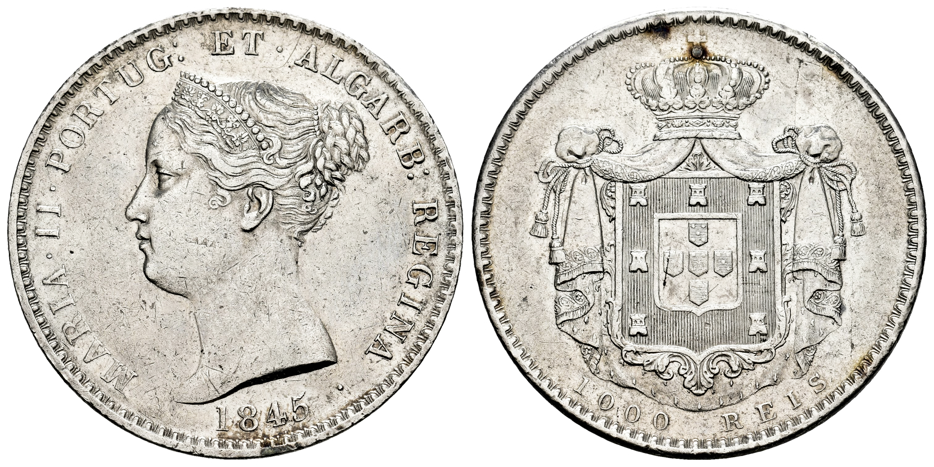 Portugal. D. Maria II (1834-1853). 1000 Reis. 1845. (Km-472). (Gomes-40.05). Ag. 29,48 g. Slightly cleaned. Choice VF. Est...120,00.