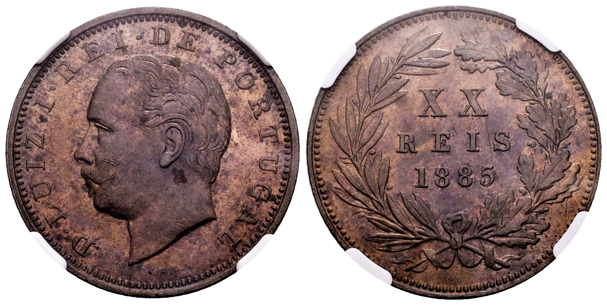 Portugal. D. Luís I (1861-1889). 20 reis. 1885. Lisbon. (Km-527). (Gomes-07.04). Ae. Slabbed by NGC as MS 62 RB. Only 2 finer specimens in the NGC census. Est...80,00.