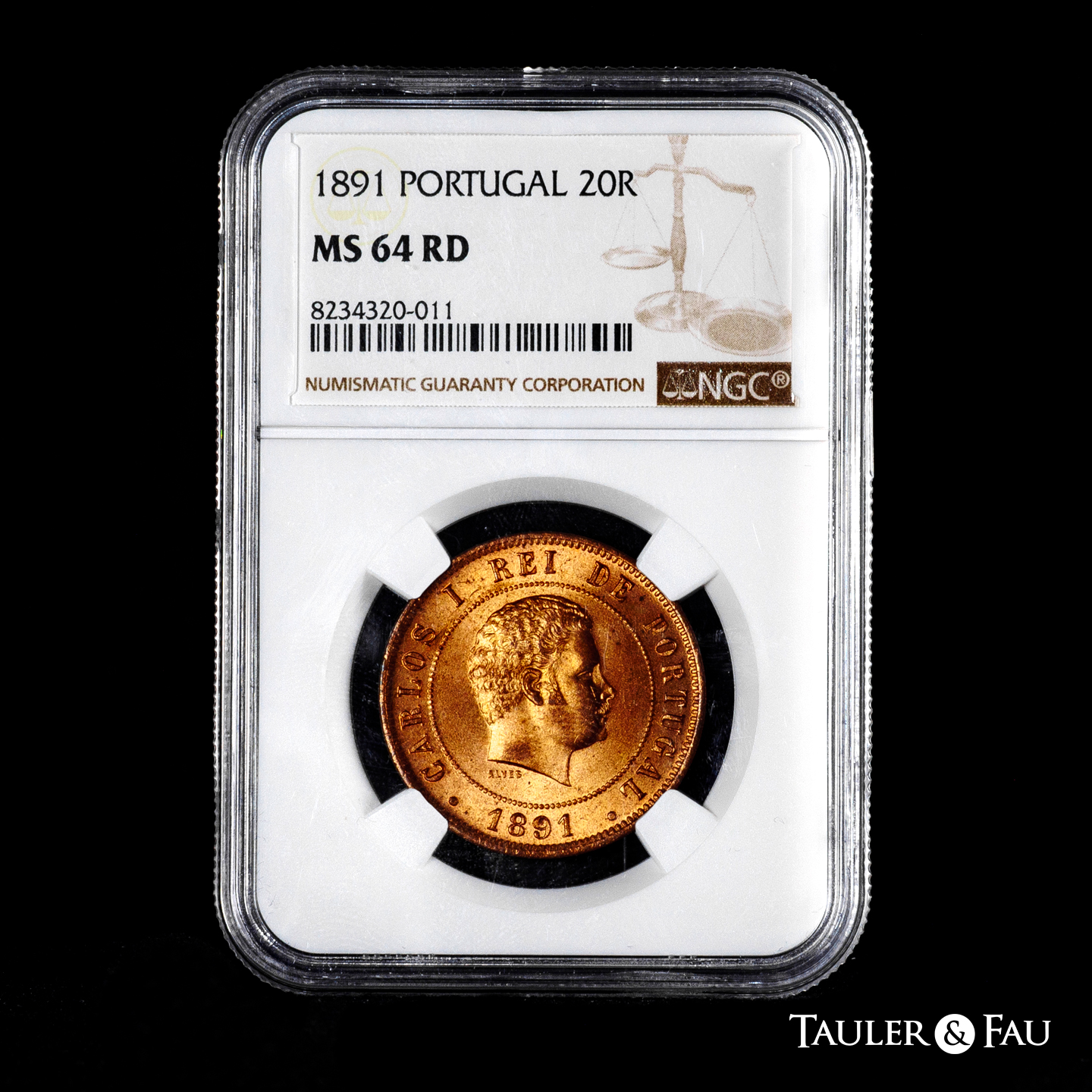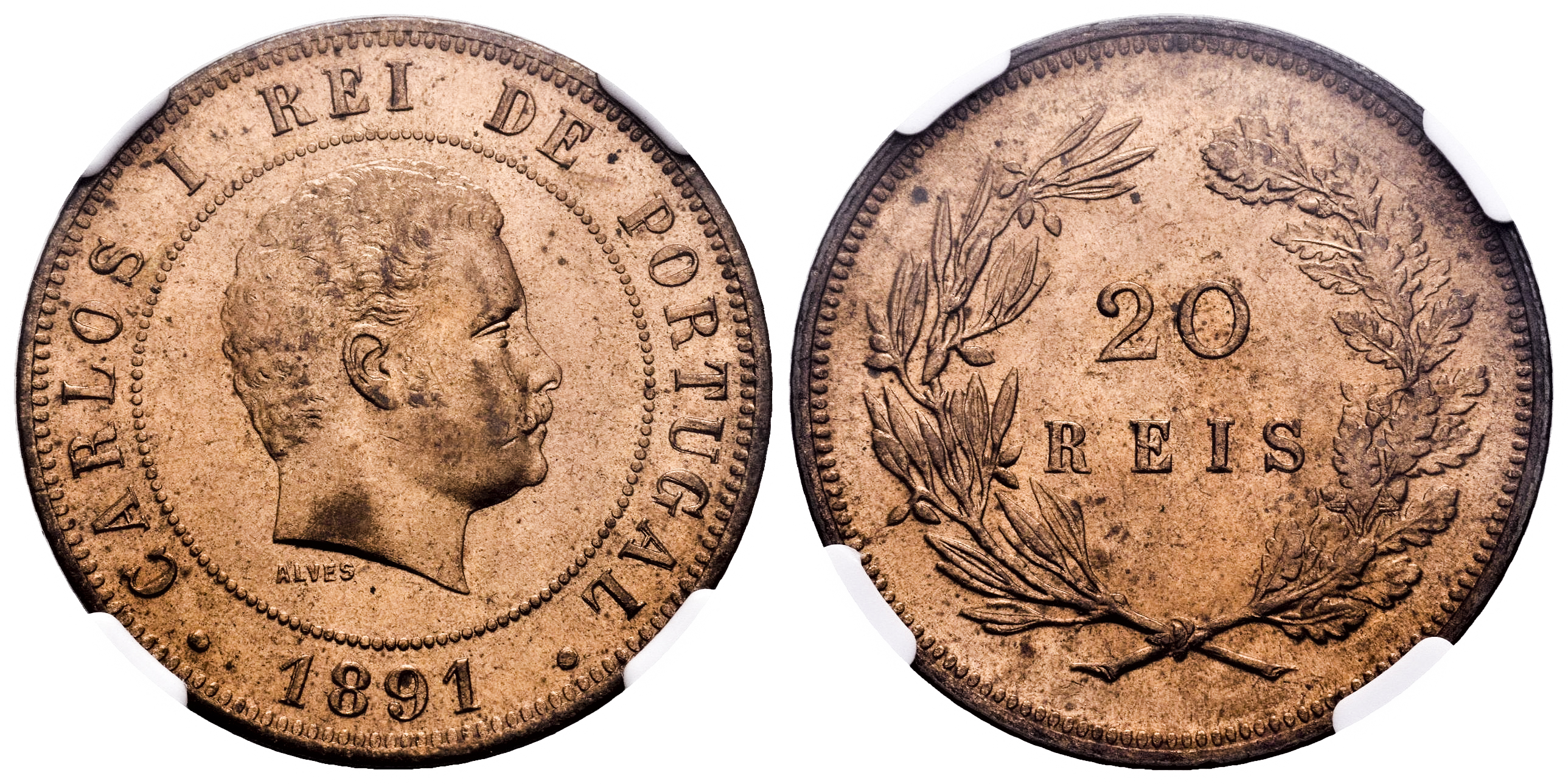 Portugal. D. Carlos I (1889-1908). 20 reis. 1891. Lisbon. (Km-532). (Gomes-C1.02). Ae. Slabbed by NGC as MS 64 RD. Only 2 finer specimens in the NGC census. Est...150,00.