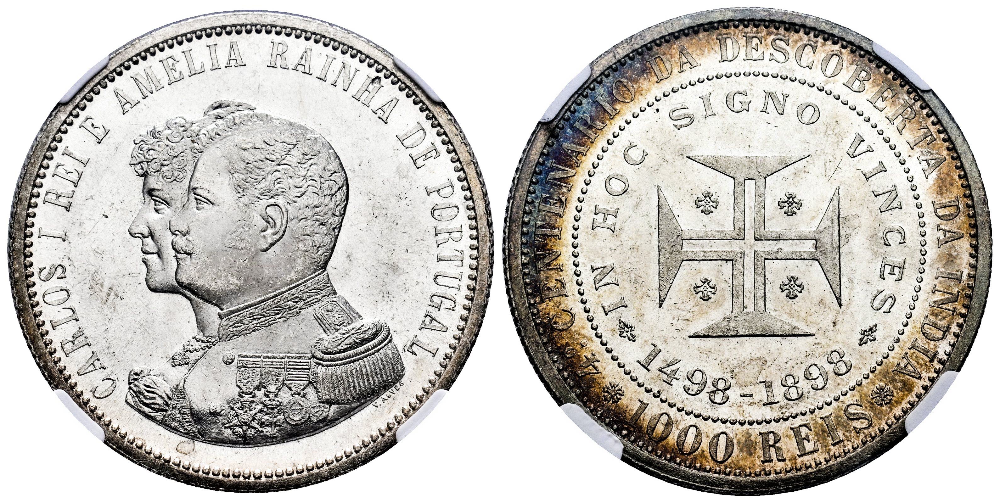 Portugal. D. Carlos I (1889-1908). 1000 Reis. 1898. Lisbon. (Km-539). (Gomes-14.01). Ag. Commemorating the 400th Anniversary of the "Discovery" of India. Full luster. Slabbed by NGC as MS 63. Est...120,00.
