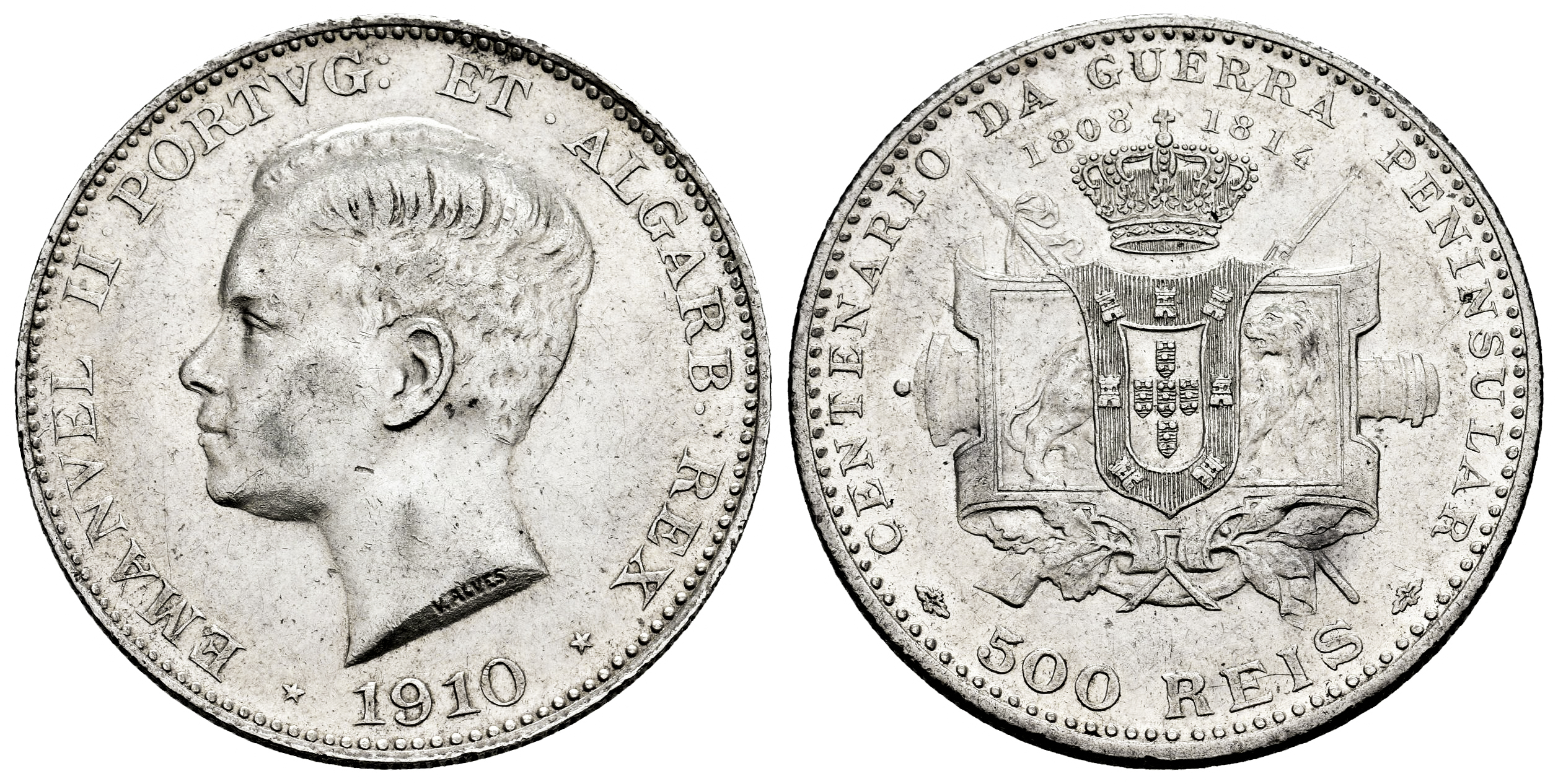 Portugal. D. Manuel II (1908-1910). 500 reis. 1910. (Km-557). (Gomes-05.01). Ag. 12,47 g. Centenary of the Peninsular War. Minor marks on obverse. Traces of luster. XF. Est...80,00.