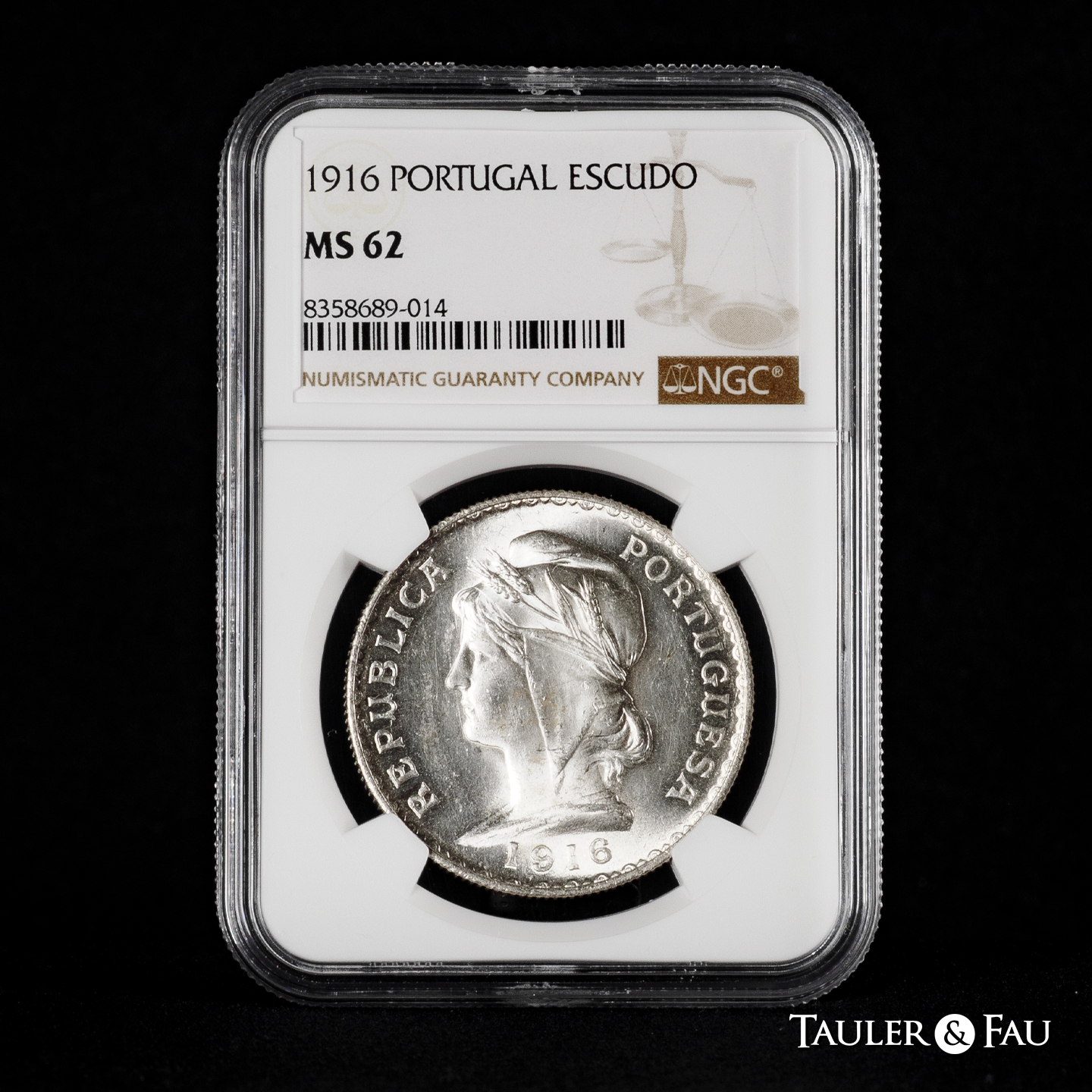Portugal. 1 escudo. 1916. Lisbon. (Km-564). (Gomes-23.02). Ag. Slabbed by NGC as MS 62. Est...100,00.
