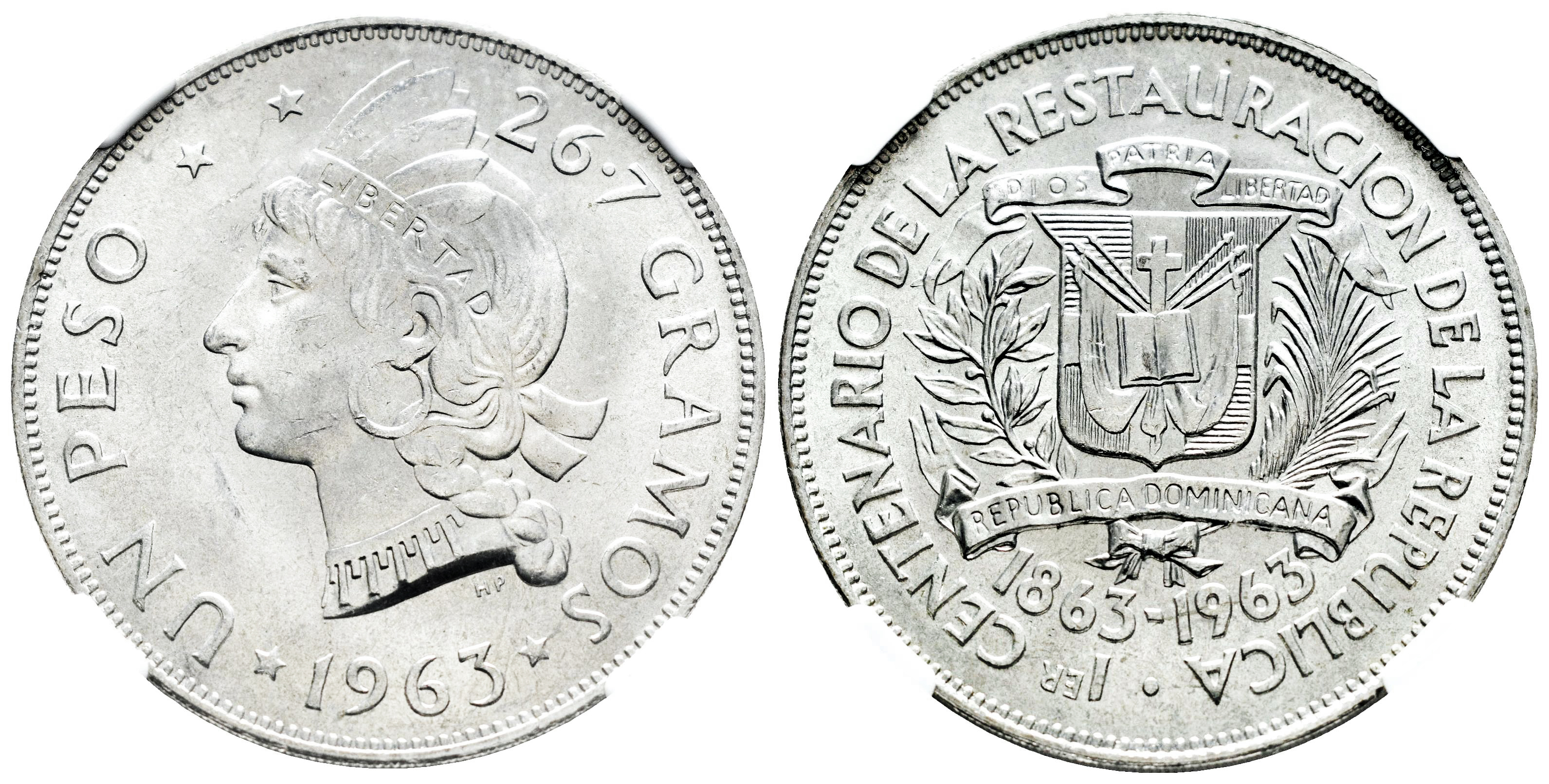 Dominican Republic. 1 peso. 1963. (Km-30). Ag. 100th Anniversary Republic. Slabbed by NGC as MS 64. Est...90,00.