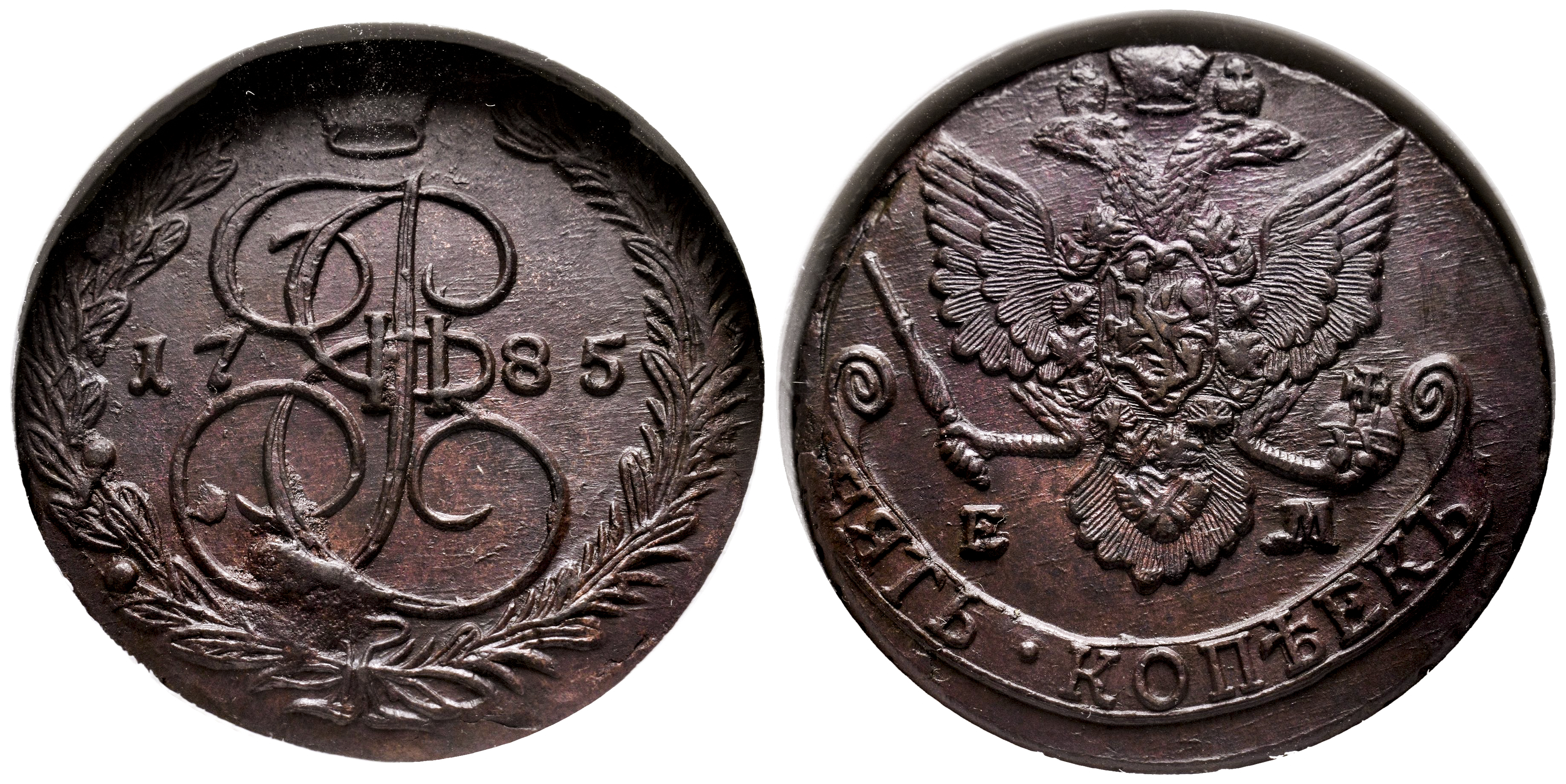 Russia. Catherine II (1762-1796). 5 kopecks. 1785. Ekaterinburg. EM. (Km-C#59.3). (Bitkin-636). Ae. Slabbed by NGC as MS 62 BN. Est...100,00.