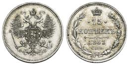 Russia. Alexander II (1855-1881). 15 kopeks. 1861. Saint Petesburg. СПБ ФБ. (Km-Y#21). (Bitkin-290). Ag. 3,15 g. Original luster. XF. Est...30,00.