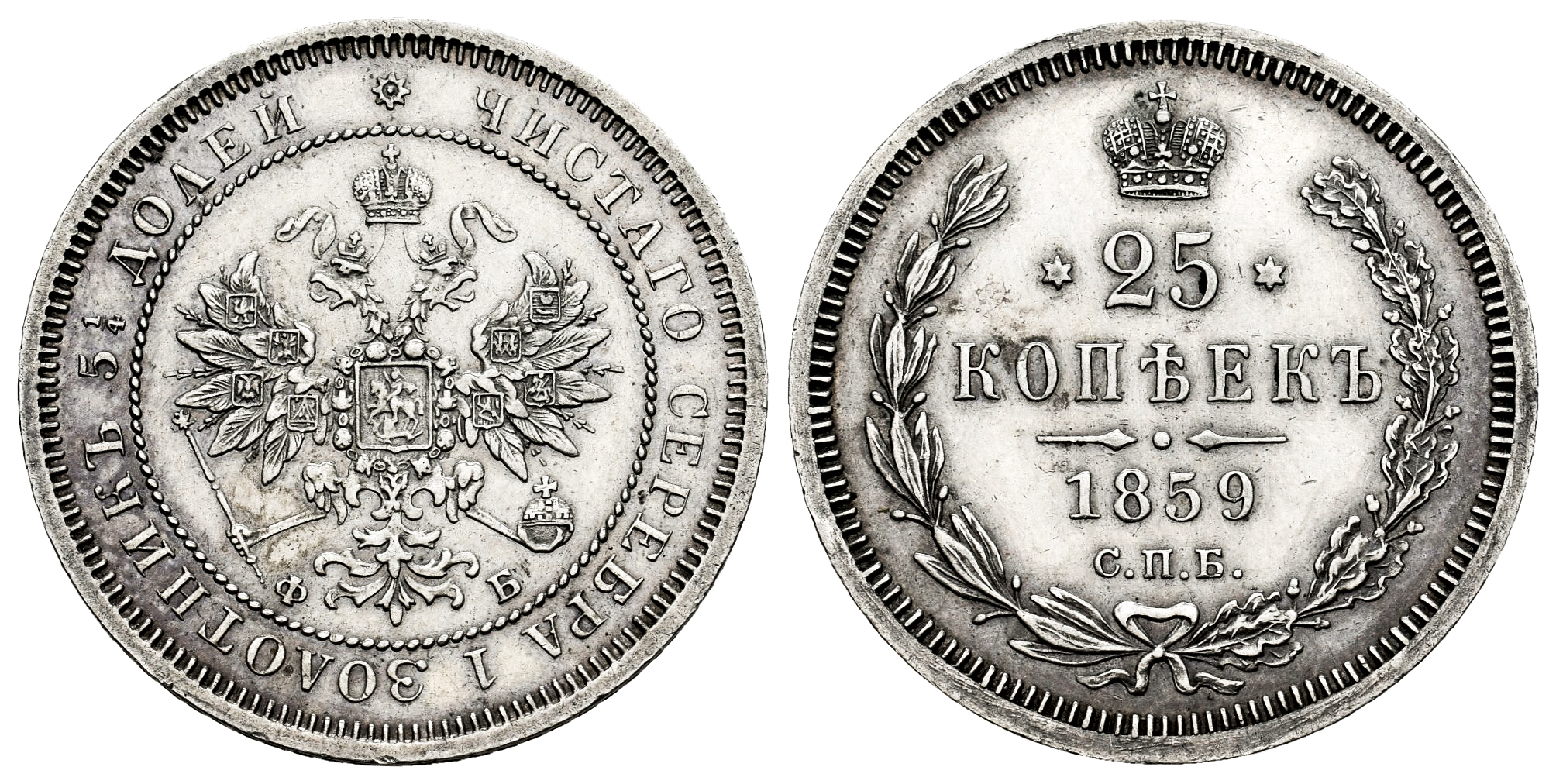 Russia. Alexander II (1855-1881). Poltina (1/2 rouble). 1859. Saint Petesburg. СПБ ФБ. (Km-Y#23). (Bitkin-131). Ag. 5,13 g. Minimal hairlines. Traces of luster. Choice VF. Est...70,00.