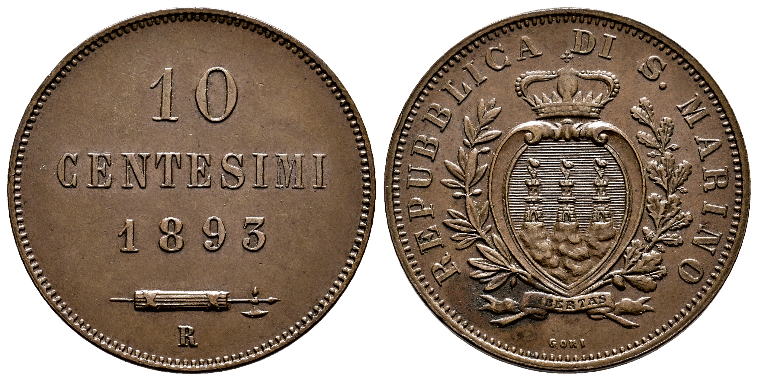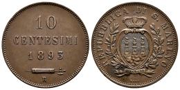 San Marino. 10 centesimi. 1893. (Pagani-371). (Gig-31). (Mont-8). Ae. 9,88 g. Minor nick on edge. XF. Est...45,00.