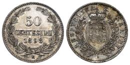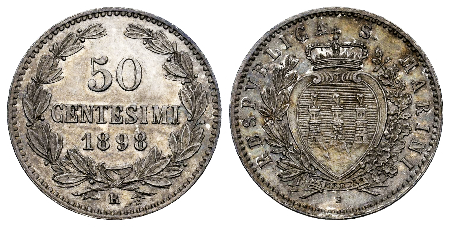 San Marino. 50 centesimi. 1898. (Pagani-369). (Gig-29). (Mont-6). Ag. 2,50 g. Nice patina with iridescent tones. Original luster. Retains the collector's handwritten tag. Almost MS. Est...80,00.