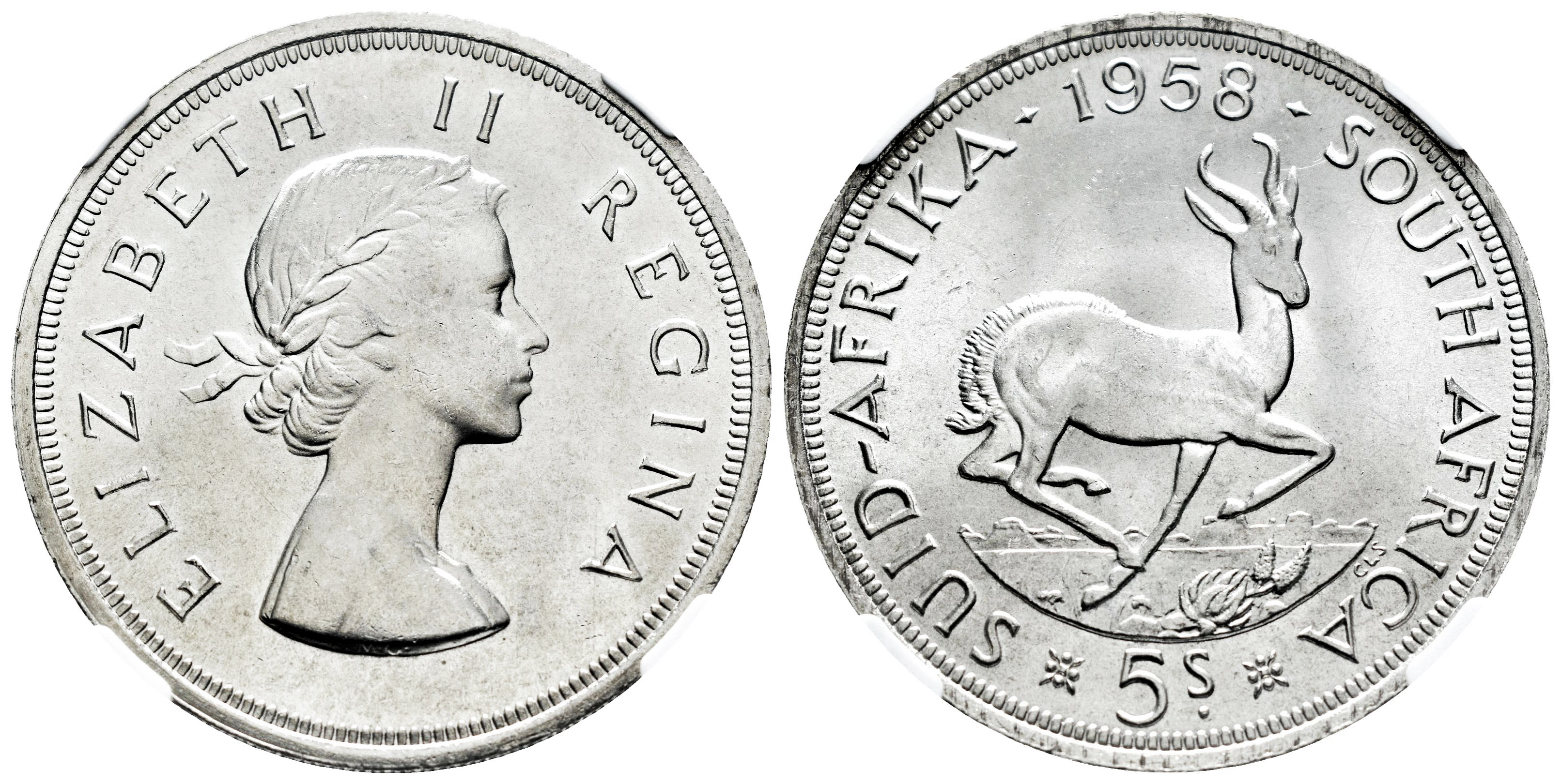 South Africa. Elizabeth II. 5 shillings. 1958. (Km-52). Ag. Slabbed by NGC as MS 64. Est...45,00.
