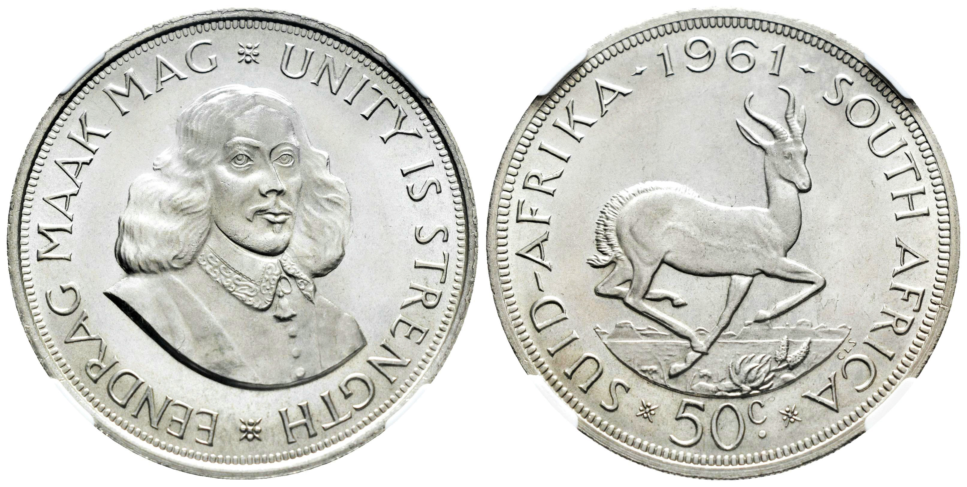 South Africa. 50 cents. 1961. (Km-62). Ag. Slabbed by NGC as PL. Est...70,00.