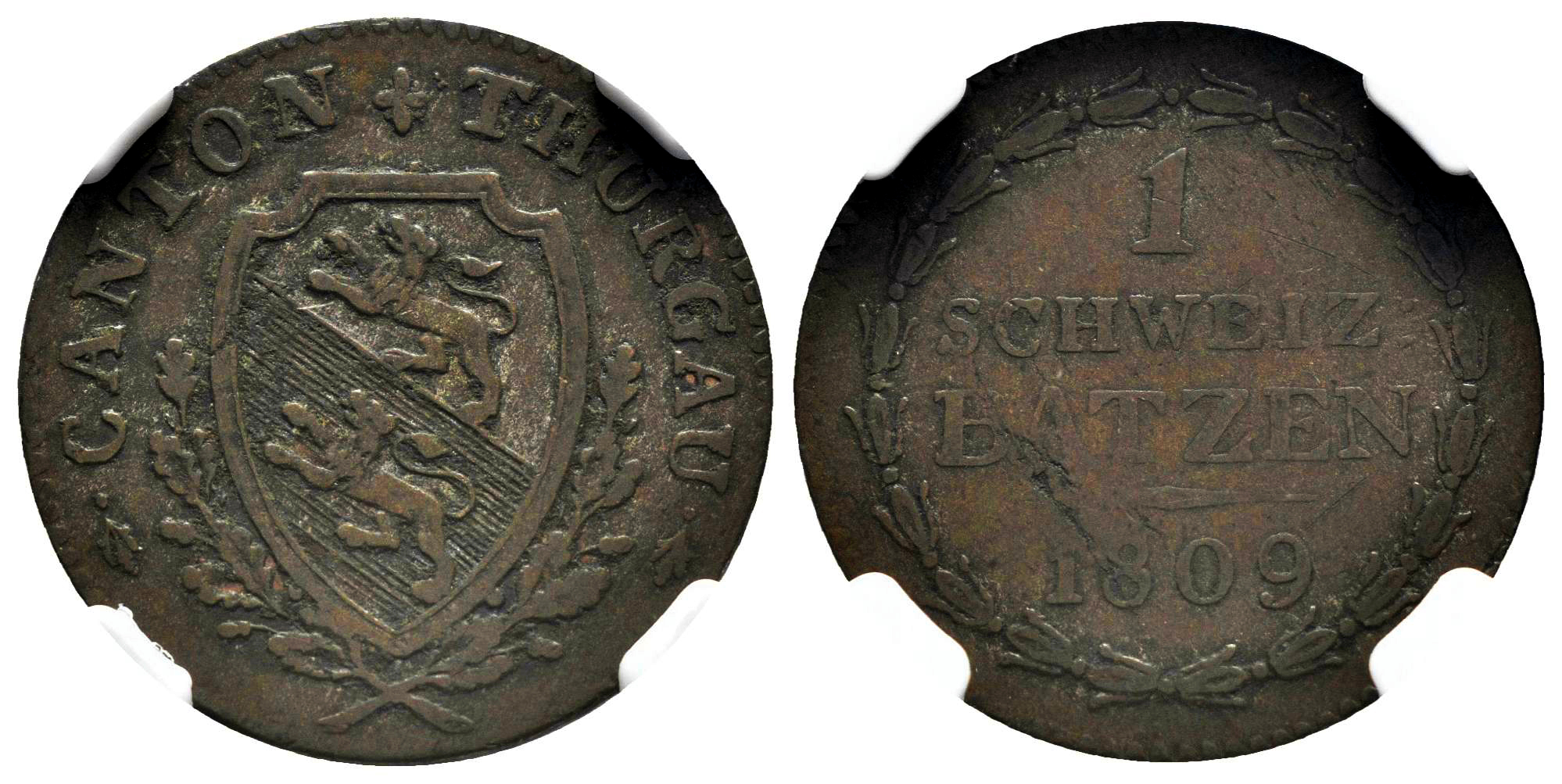 Switzerland. 1 batzen. 1809. Thurgau. (Km-7). Au. Slabbed by NGC as XF 45. Est...50,00.