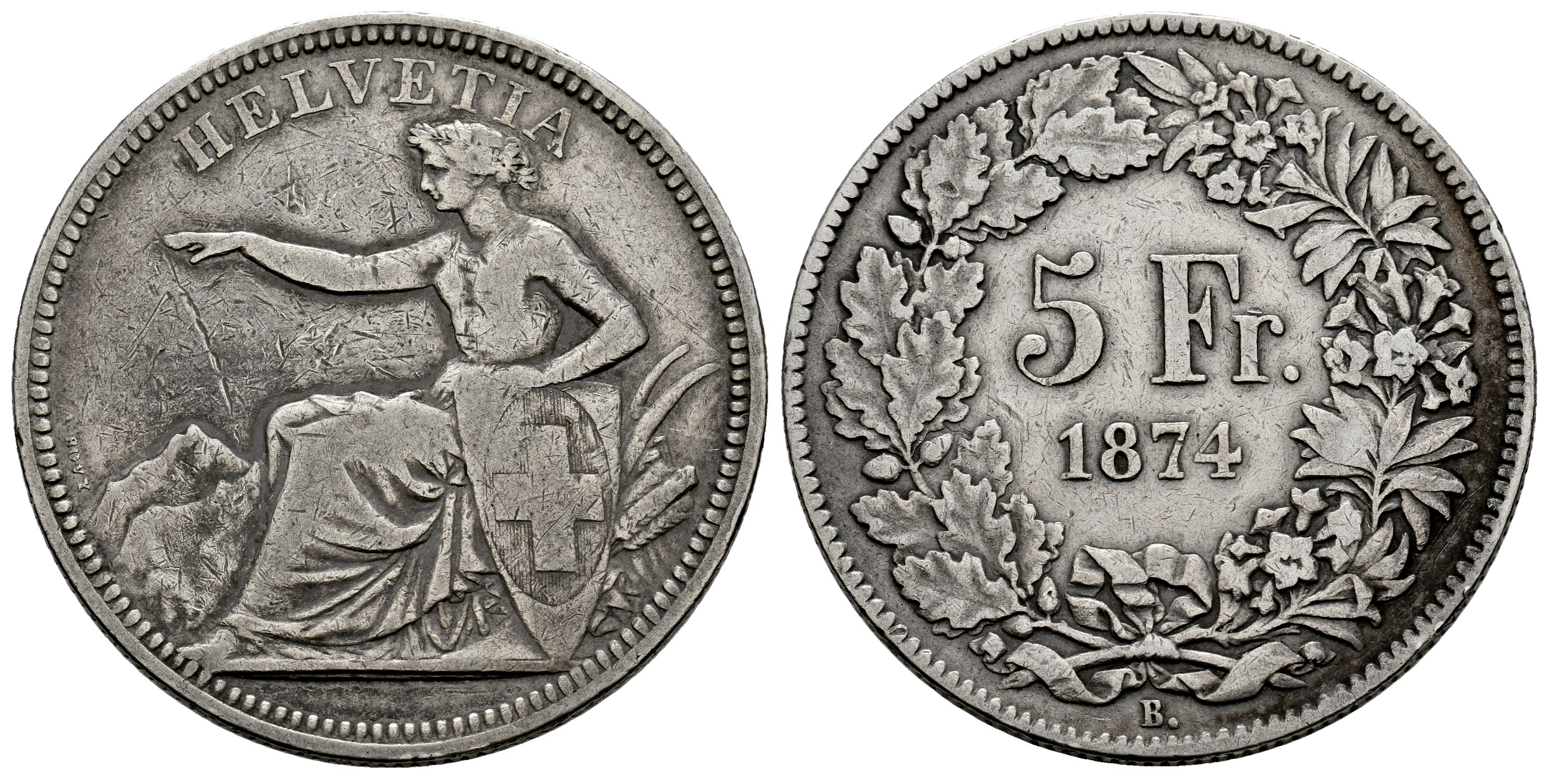 Switzerland. 5 francs. 1874. Bern. B. (Km-11). Ag. 24,80 g. Almost VF. Est...120,00.