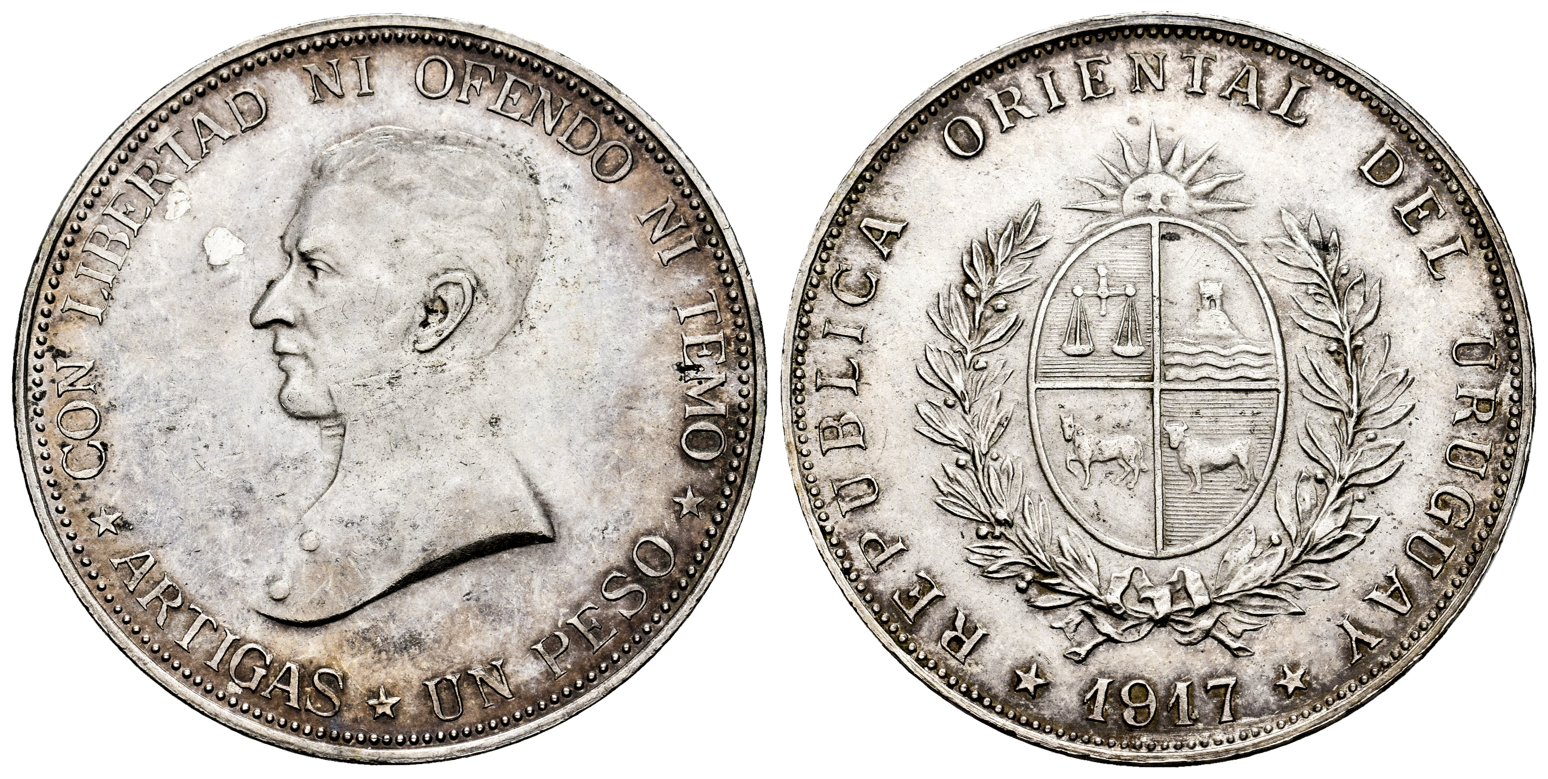 Uruguay. 1 peso. 1917. (Km-23). Ag. 25,09 g. Lightly toned. Original luster. AU. Est...150,00.