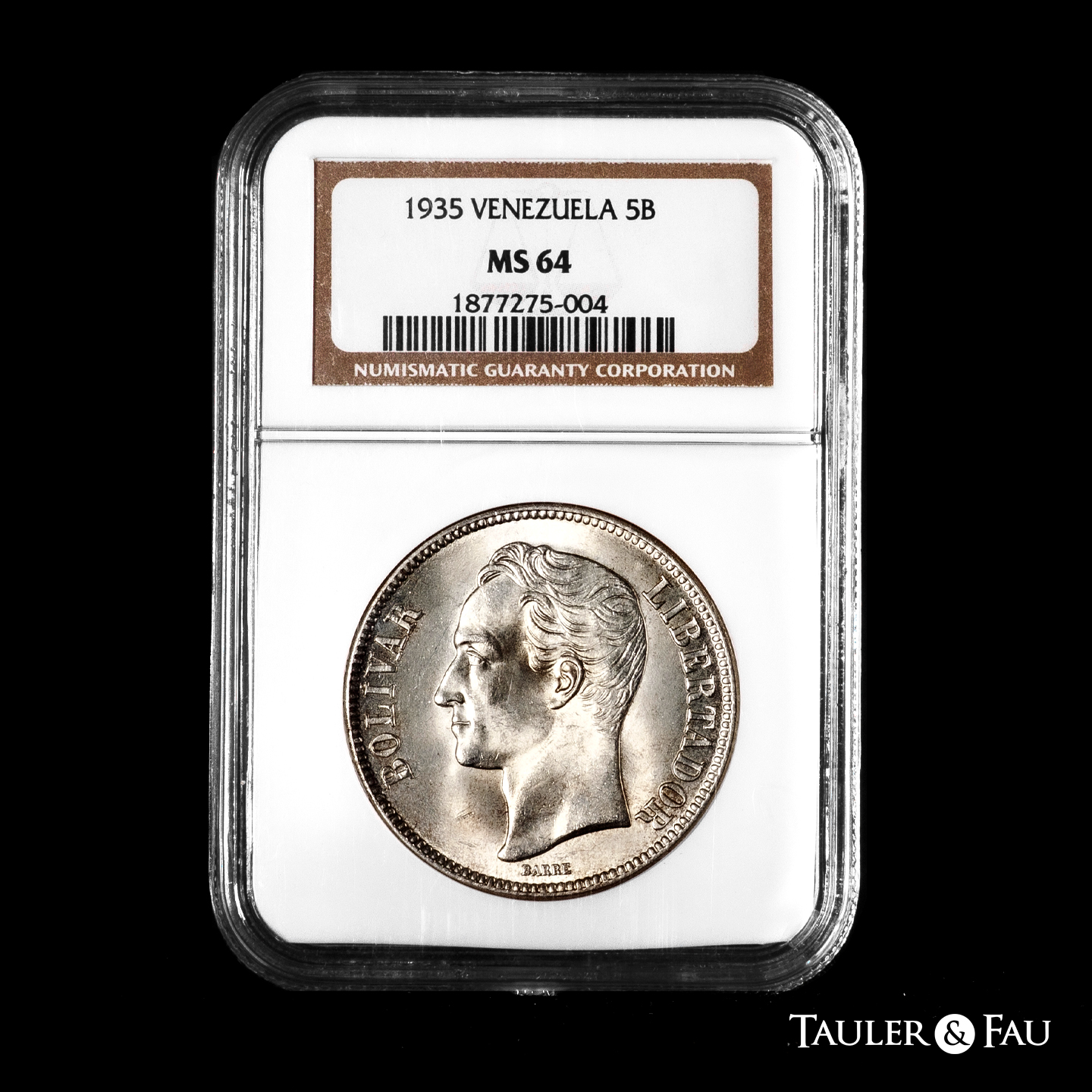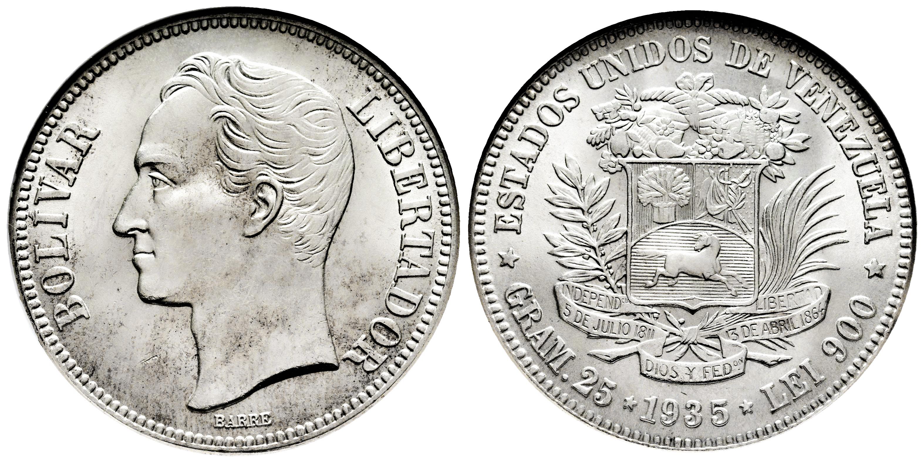 Venezuela. 5 bolivares. 1935. Philadelphia. (Km-Y#24.2). Ag. Original luster. Slabbed by NGC as MS 64. Est...200,00.