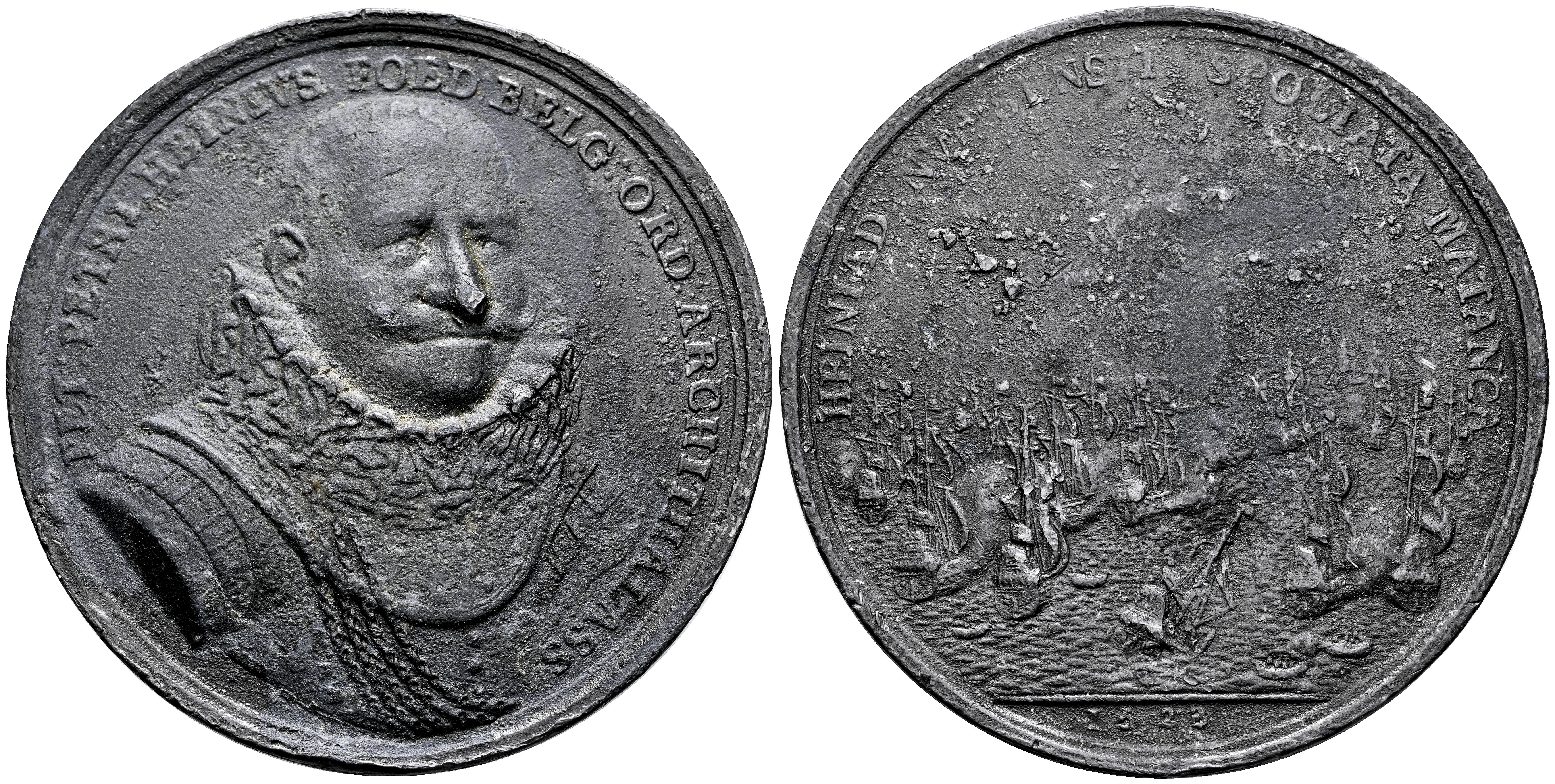 Low Countries. Medal. 1628. Admiral Piet Heyn. (Van Loon-II, p. 172, 1). (Betts-26). (TMNK-00430). Anv.: PET : PETRI . HEINIVS . FOED : BELG : ORD : ARCHITHALASS Bare-head bust of Piet Heyn three-quarter facing to right, wearing high ruff, cuirass and necklace of chains. Rev.: HEINIAD NVP[ER] SENSIT SPOLIATA MATANCA View of the victory, by Dutch fleet under Heyn, over the Spanish Treasure Fleet at Matanzas Bay in Cuba. . 89,53 g. 59 mm. Very rare. Struck late in the 17th century from dies by Johannes (Jan) Smeltzing (1656-1693), this medal commemorates one of the great Dutch naval victories against Spain: not only was it almost bloodless, it also provided the Dutch with over 11 million guilders in booty. That was enough to finance the entire Dutch army for some 8 months, which helped to enable the Dutch capture of the great fortress of s'Hertogenbosch by Frederick Henry of Orange in 1629. Heyn's ability as an admiral was so remarkable that he was able to take the treasure fleet without, apparently, a single Dutch casualty; very few Spanish were killed as well. Even more amazingly, after the Spanish ships surrendered Heyn arranged that their crews were given enough supplies to allow them to march back to Havana. Choice VF. Est...550,00.