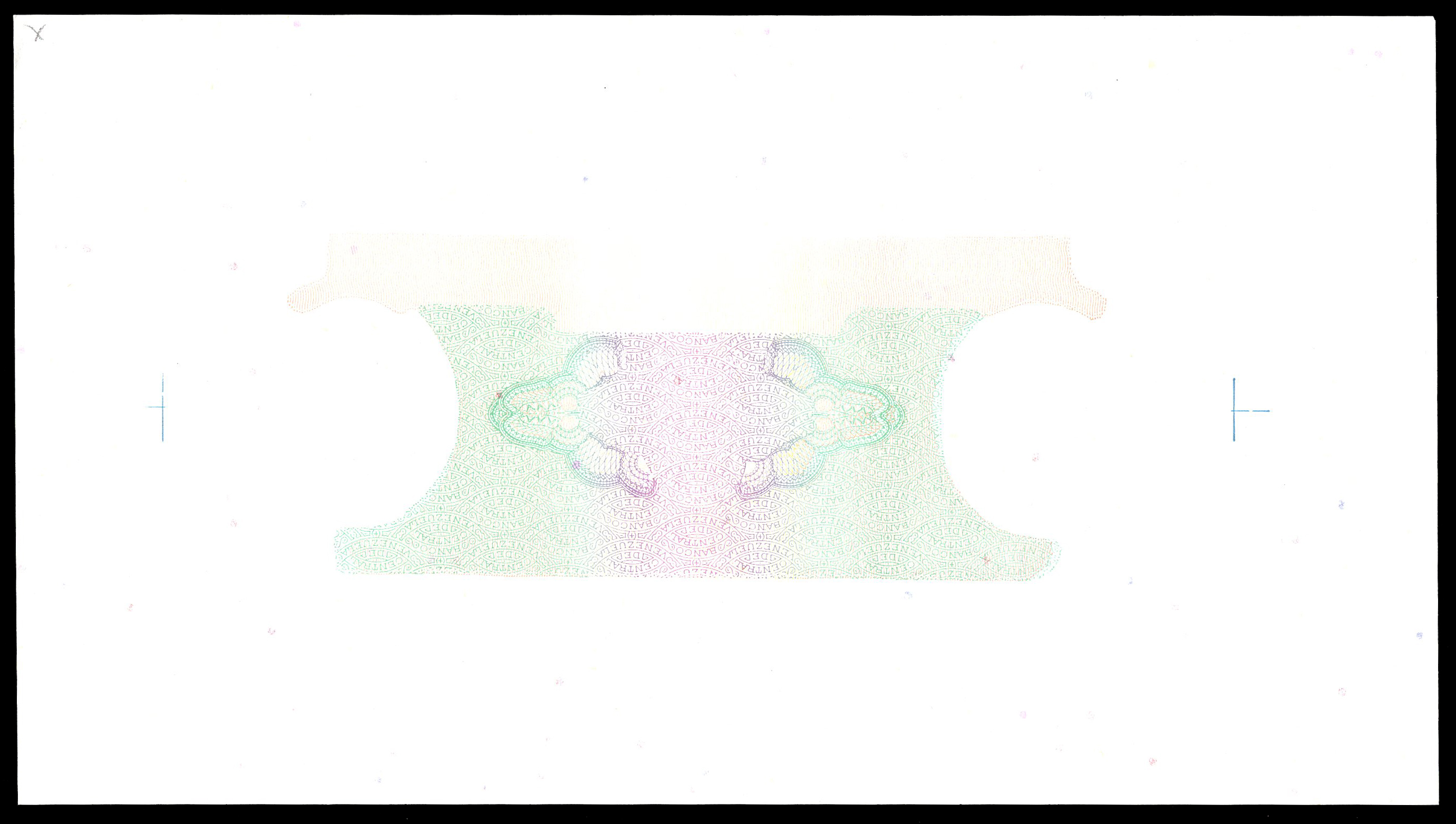 Venezuela. 10 bolivares. ND (1971-1979). Caracas. (Pick-Type 51g proof). Printer proof of the multicolored interior grid design. Large, uncropped fragment showing the adjustment marks. Slight paper curl in the lower right corner. Very rare. Almost MS. Est...300,00.
