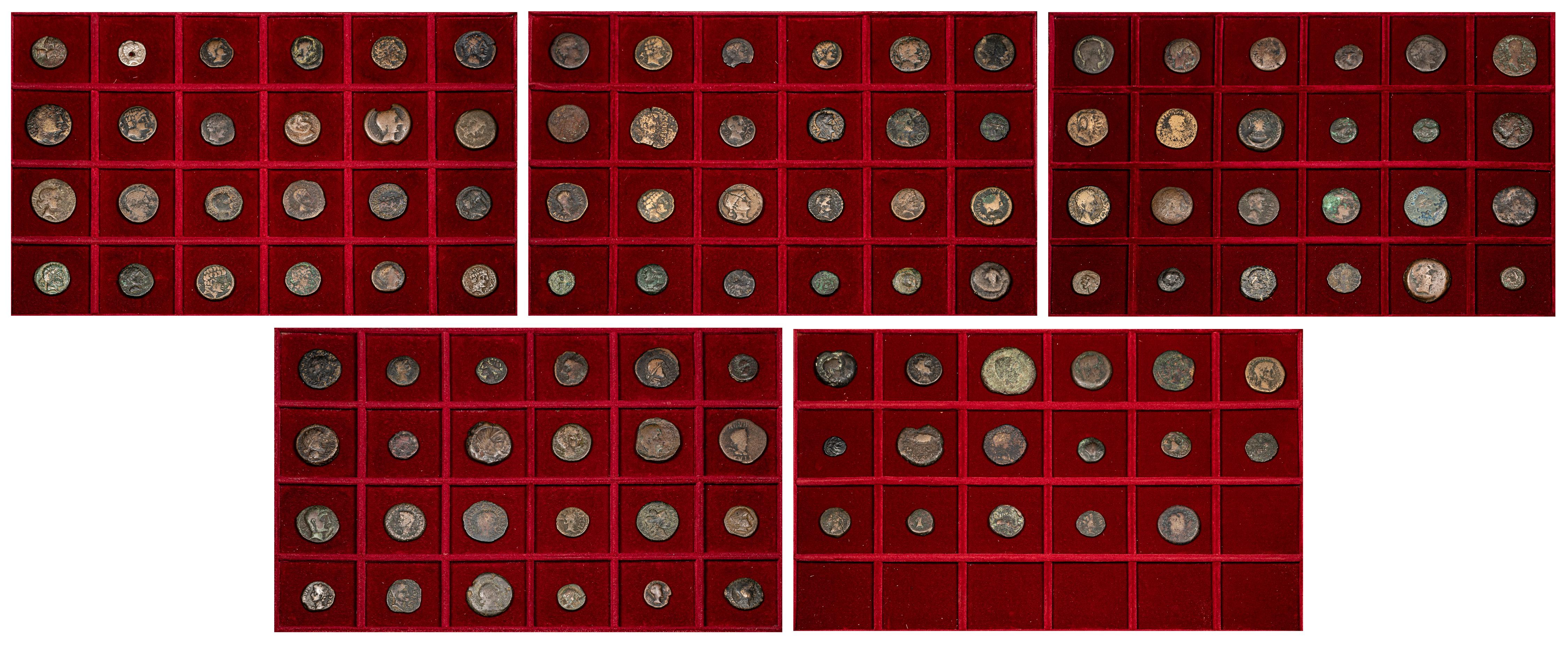 Lot of 133 Iberian pieces in an elegant Beumer album. All bronze; also includes a pierced denarius of Konterbia Karbika. A wide range of mints represented, including Segóbriga, Osca, Bolskan, Ilipense, Lastigi, Carteia, Emerita Augusta, Kastilo, Gades, Obulco, Titiakos, Sekaisa, Sekia, and Cartagonova, among others. Very interesting. It is essential a rigorous examination of the lot. ONLY SHIPPING TO SPAIN PENINSULA. NO RETURNS ALLOWED. F/Almost VF. Est...2000,00.