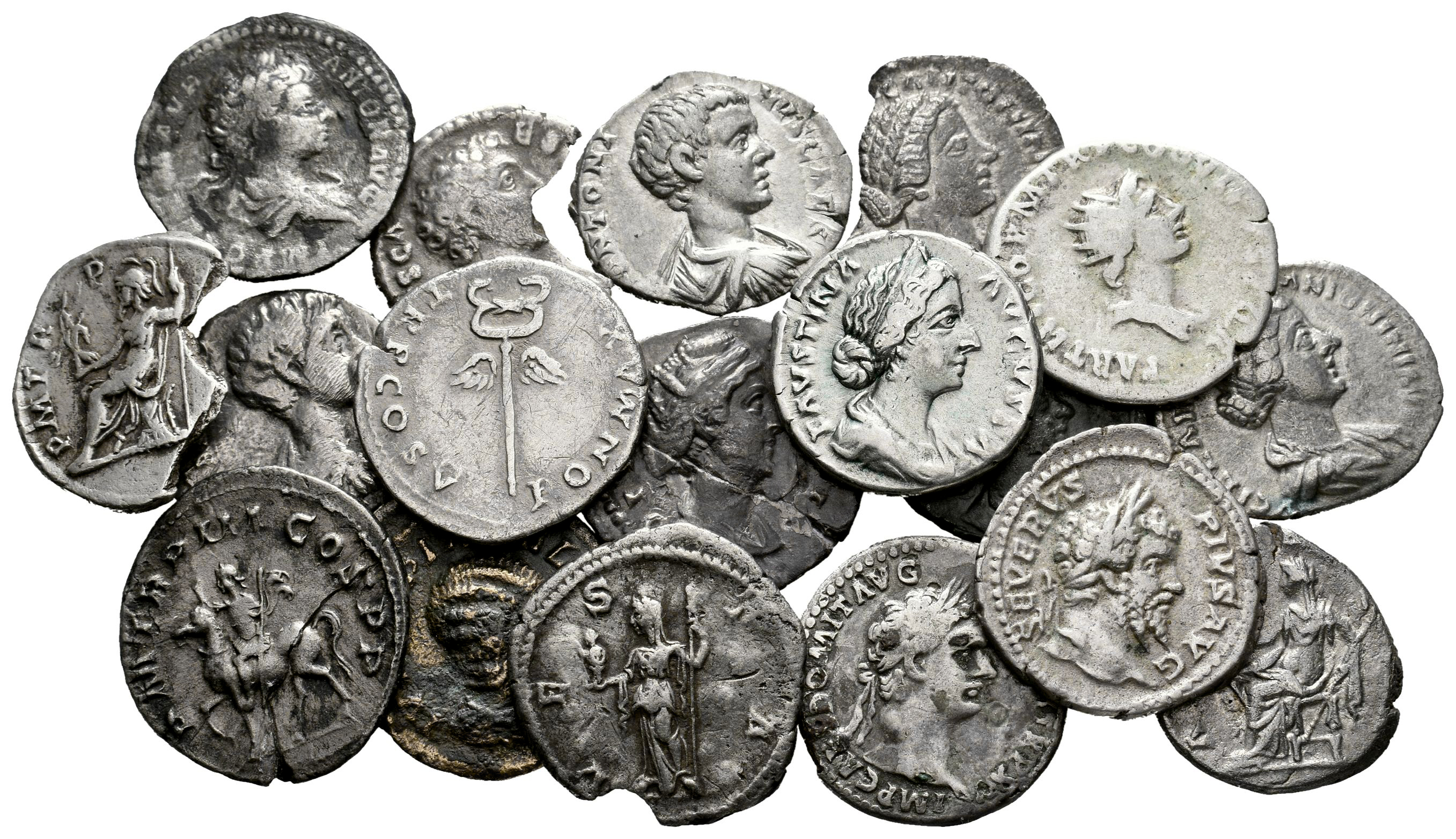 Lot of 18 coins from the Roman Empire. Denarii from a wide variety of emperors, such as: Domitian, Vespasian, Marcus Aurelius, Diva Faustina, Trajan, Hadrian, Lucilla, Septimius Severus, Julia Domna, Geta, Caracalla, Julia Mamaea, and Gordian III. Includes some rare, limes, fractured, and fourrée coins. Ar/Ae. It is essential a rigorous examination of the lot. ONLY SHIPPING TO SPAIN PENINSULA. NO RETURNS ALLOWED. F/VF. Est...300,00.