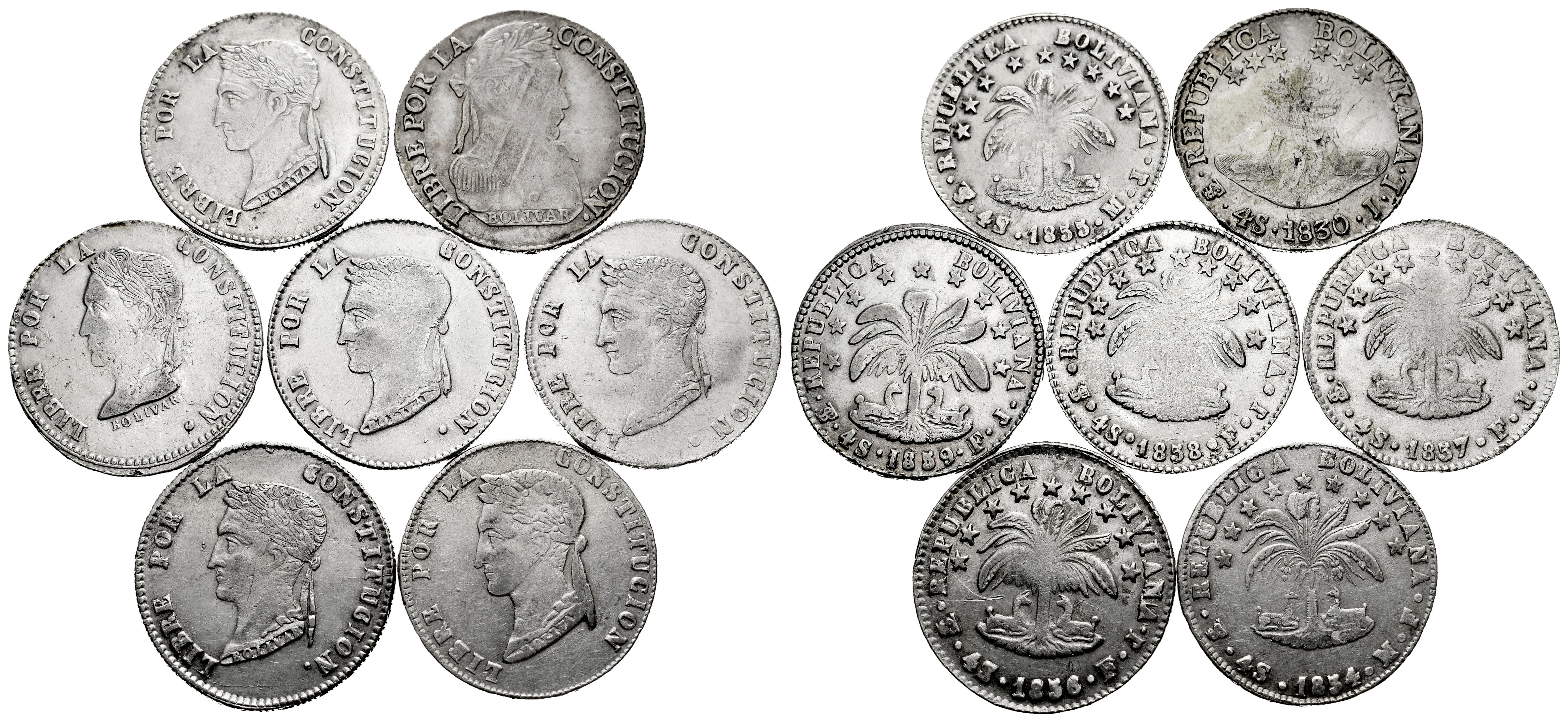 Lot of 7 coins of 4 soles from Bolivia minted in Potosi; 1830, 1833, 1855, 1856, 1857, 1858 and 1859. It is essential a rigorous examination of the lot. ONLY SHIPPING TO SPAIN PENINSULA. NO RETURNS ALLOWED. VF/Choice VF. Est...300,00.