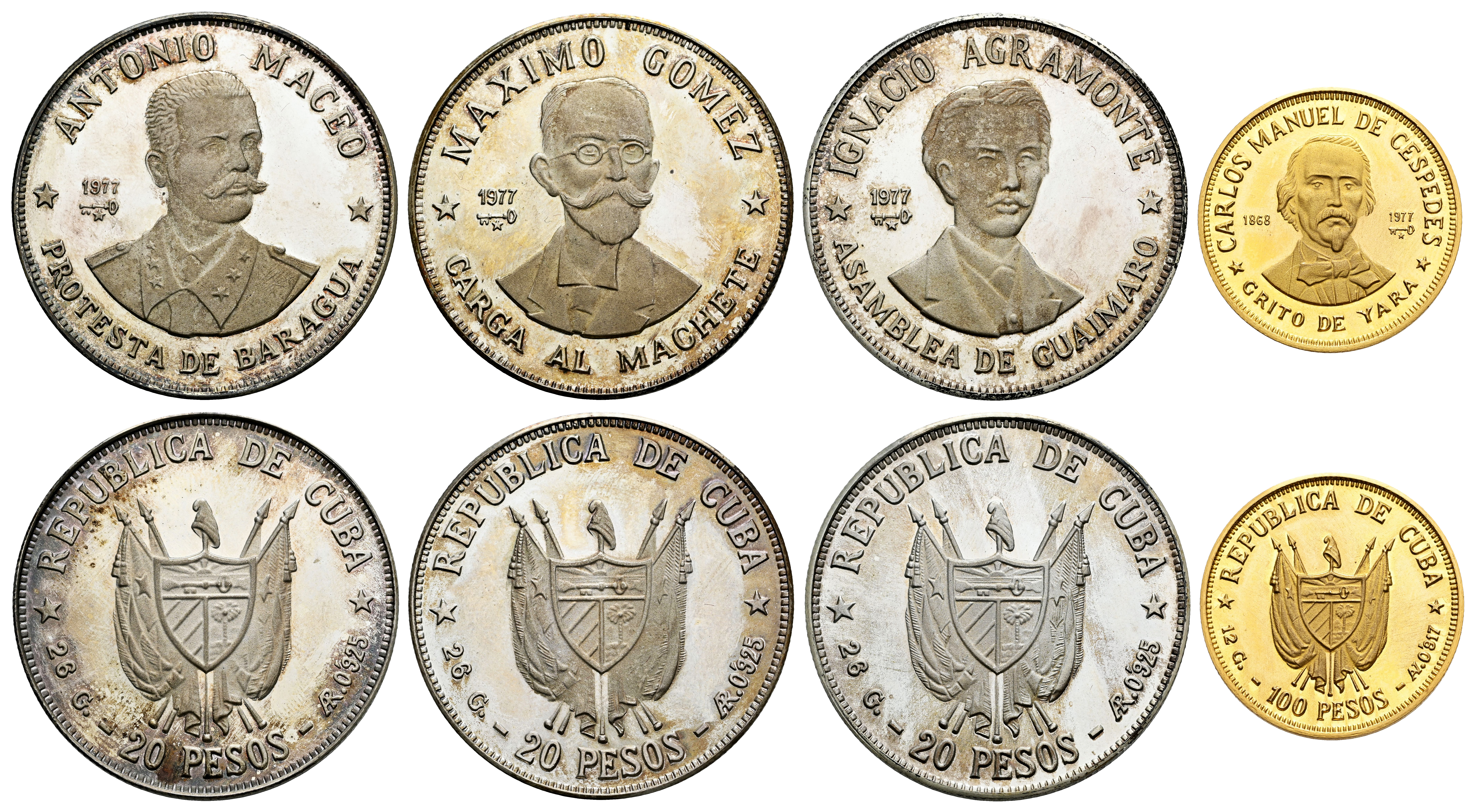 Cuba. Cuba Set of 4 Proof Coins 1977 "Figures in the History of Cuba" KM# PS7; Each Silver Coin: Silver (.925) 26.00 g., Gold (.917) 12.00 g.; Figures in the History of Cuba; Mintage 70000 pcs.; With original box. Est...1200,00.