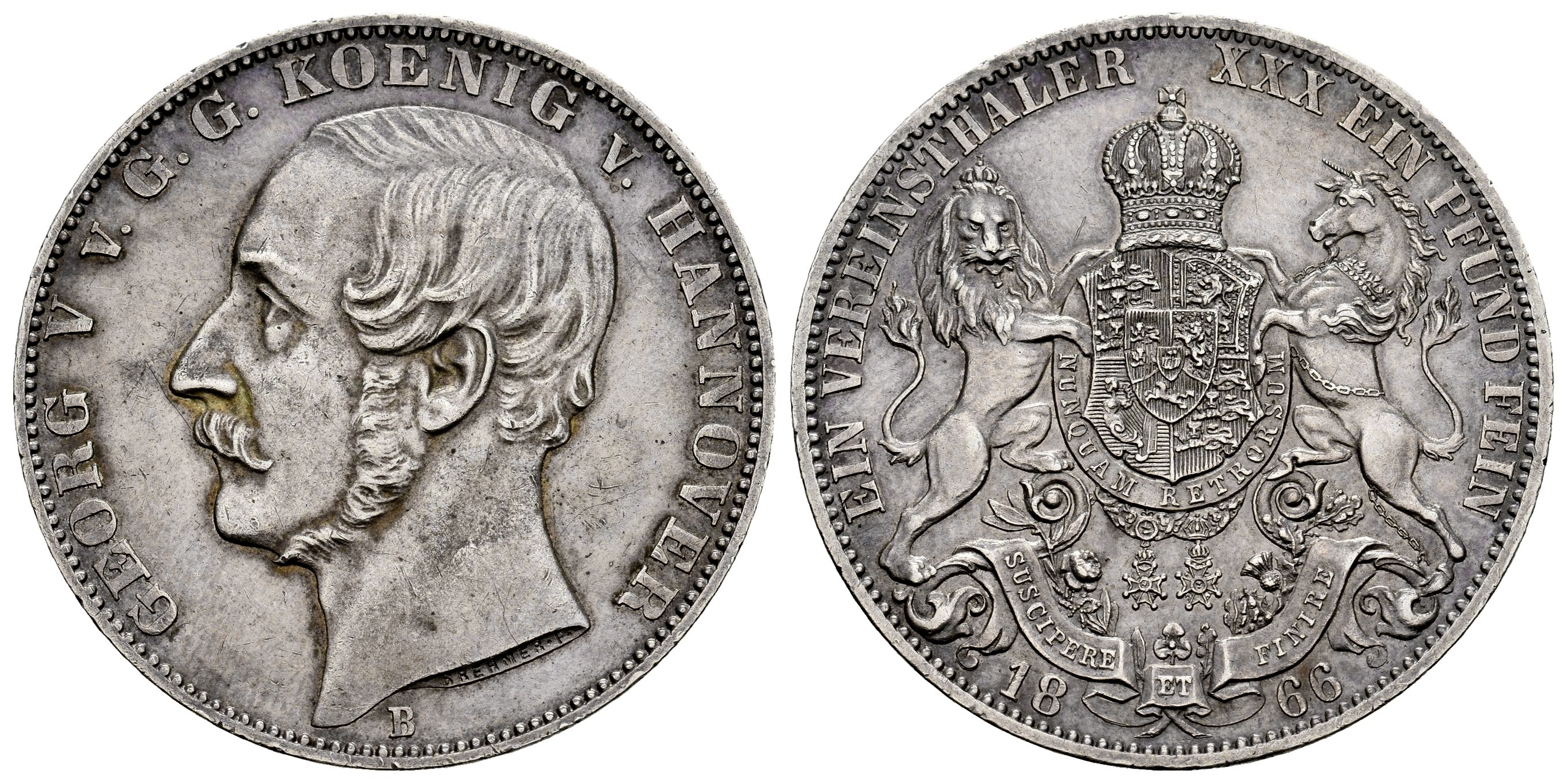 Germany. Hannover. Georg V. 1 taler. 1866. B. (Km-230). Ag. 18,53 g. Lightly toned. XF. Est...110,00.