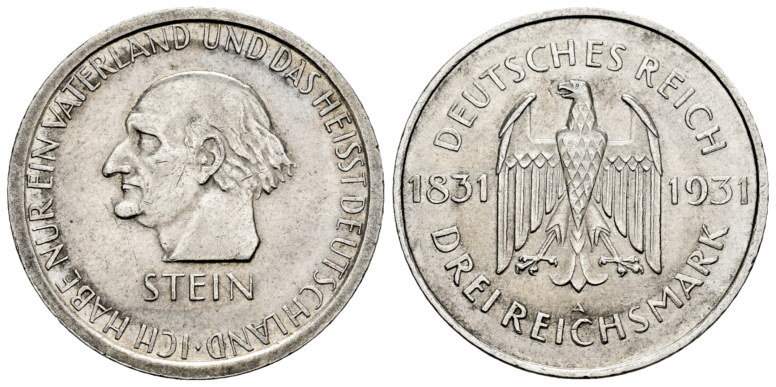 Germany. Weimar Republic. 3 reichsmark. 1931. Berlin. A. (Km-73). Ag. 15,06 g. Centenary of the Death of von Stein. Minor marks. Scarce. AU. Est...150,00.