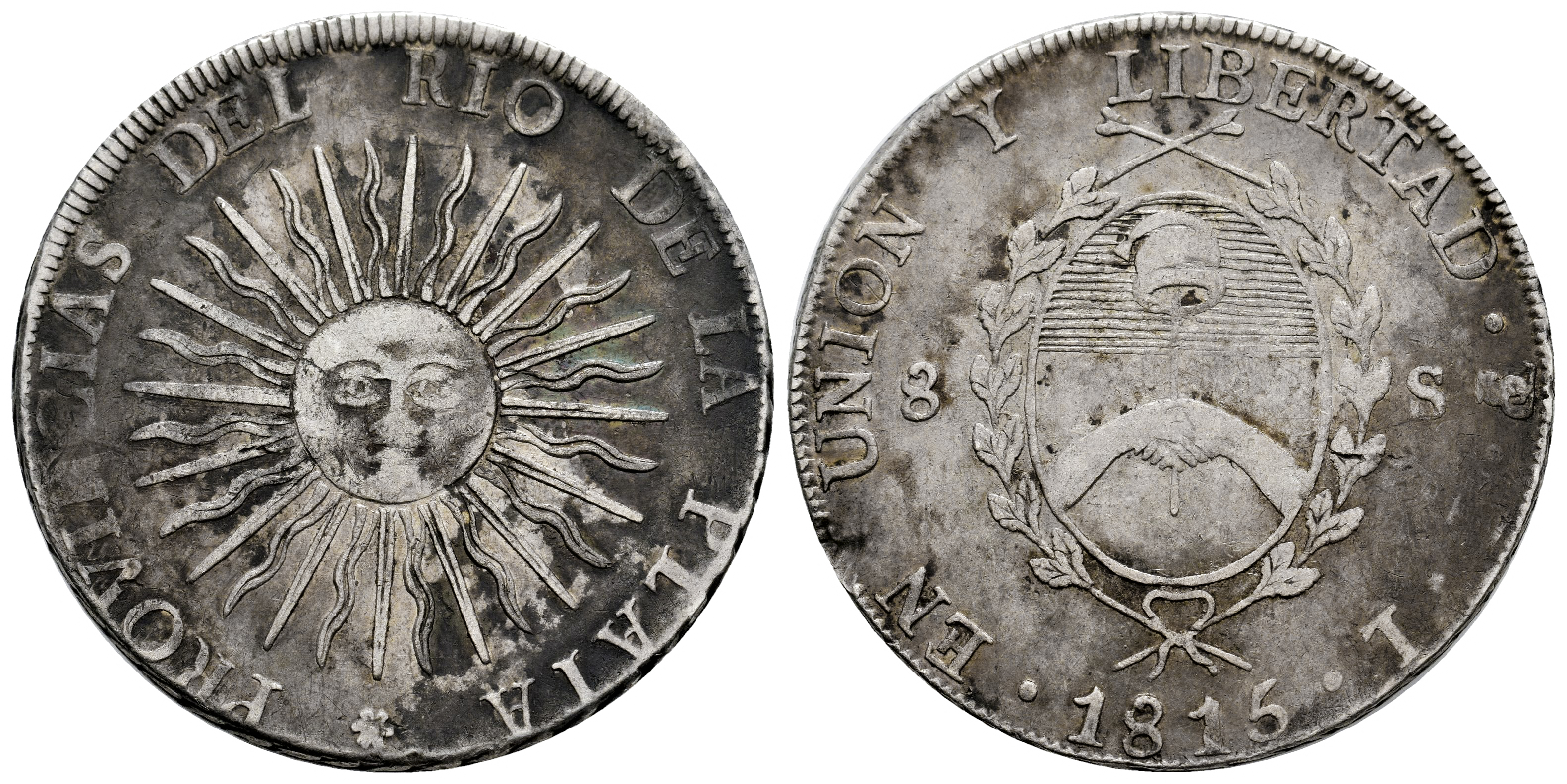 Argentina. United Provinces of Río de la Plata. 8 soles. 1815. Potosi. FL. (Km-15). Ag. 26,74 g. Irregular patina. Scarce. Almost VF/VF. Est...350,00.