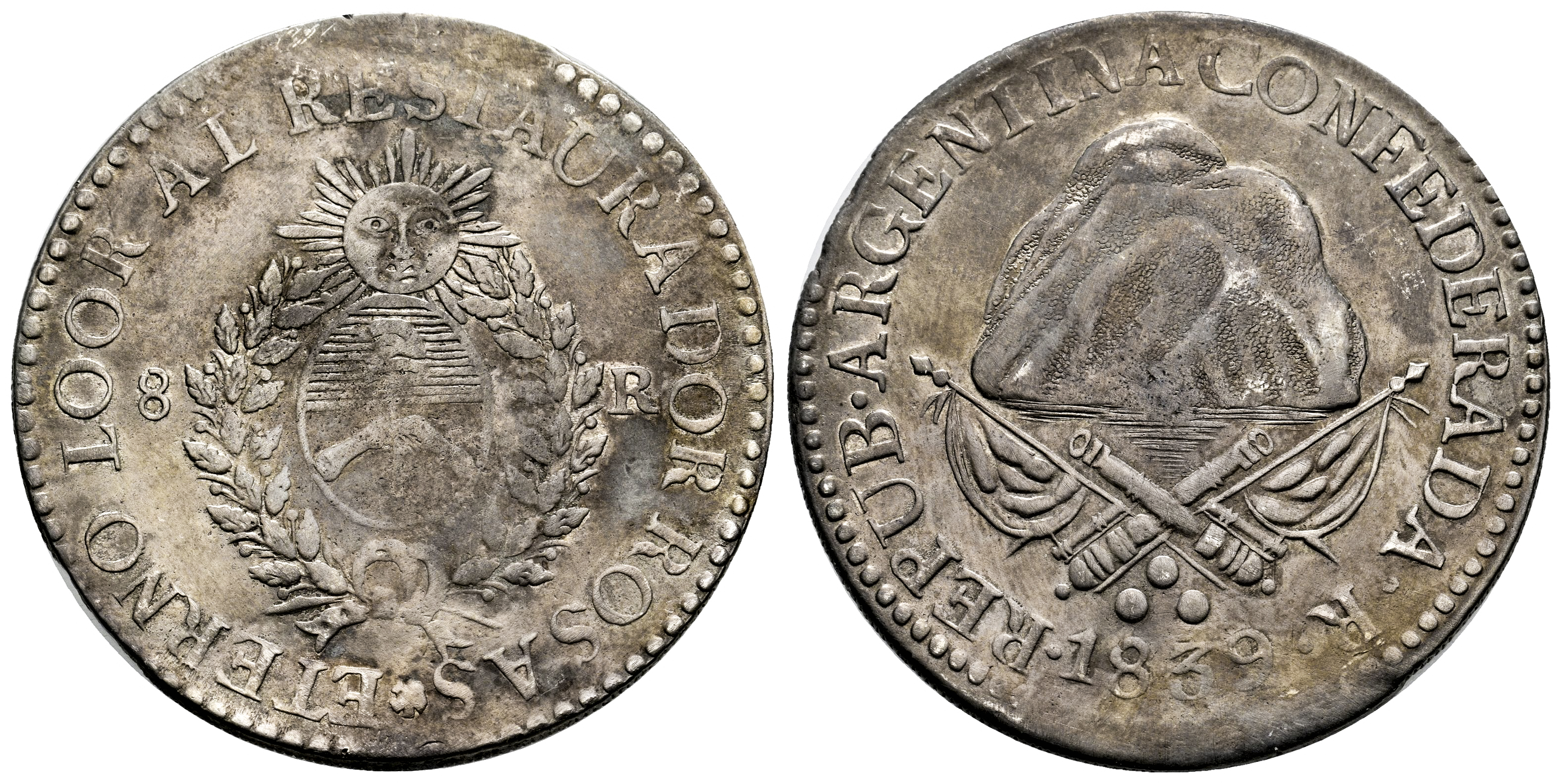 Argentina. 8 reales. 1839. La Rioja. (Km-8). (CJ-56.1). Ag. 26,13 g. Traces of welding at 12 o´clock on edge. Choice VF. Est...250,00.
