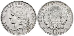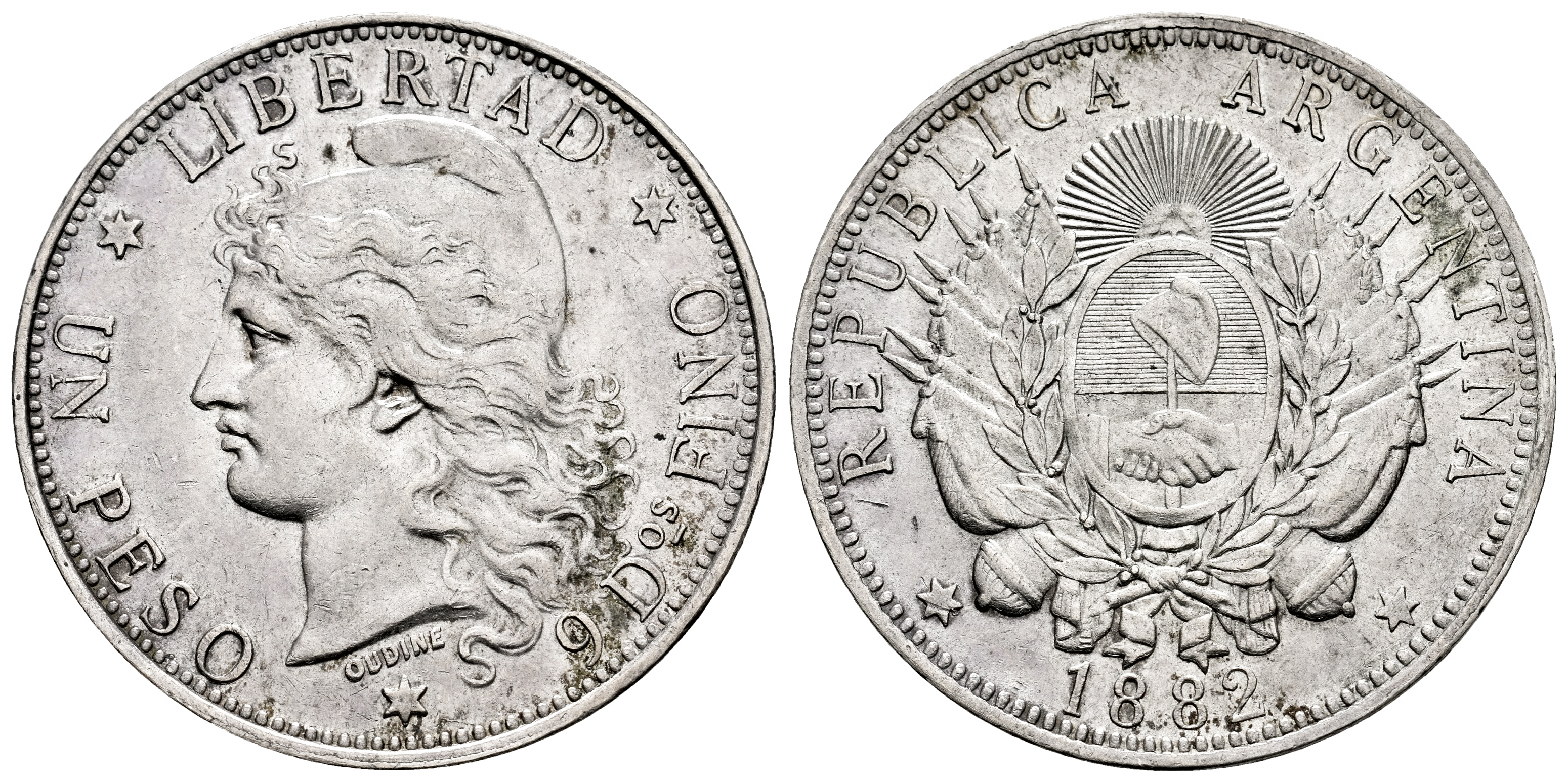 Argentina. 1 peso. 1882. (Km-29). Ag. 24,98 g. Slightly cleaned. Scarce. Almost XF. Est...350,00.