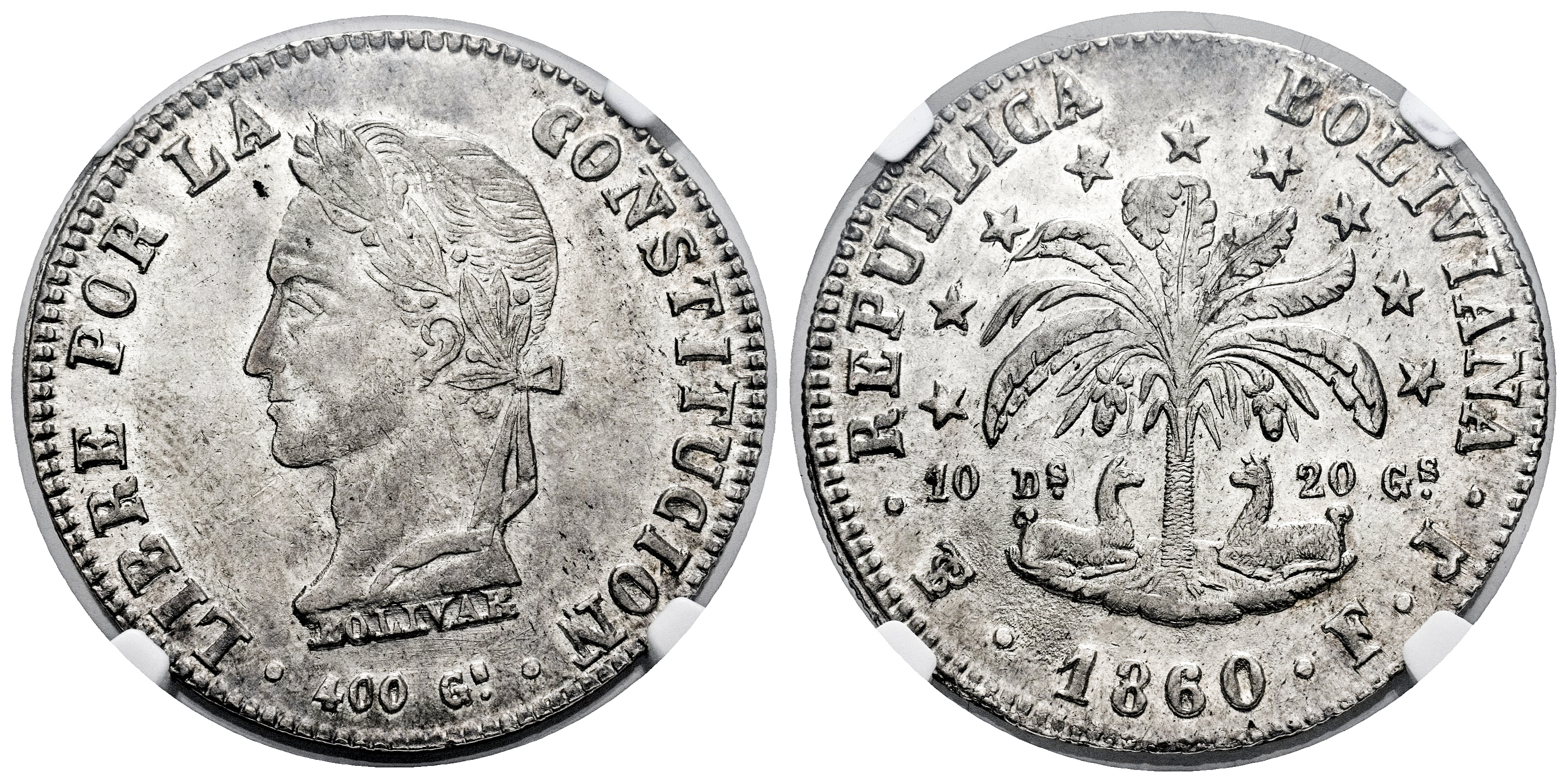 Bolivia. 8 soles. 1860. Potosi. FJ. (Km-138). Ag. "D 20 Gs" under palm tree. Soft tone and luster. Slabbed by NGC as AU 58. Only 2 finer specimens in the NGC census. Est...200,00.