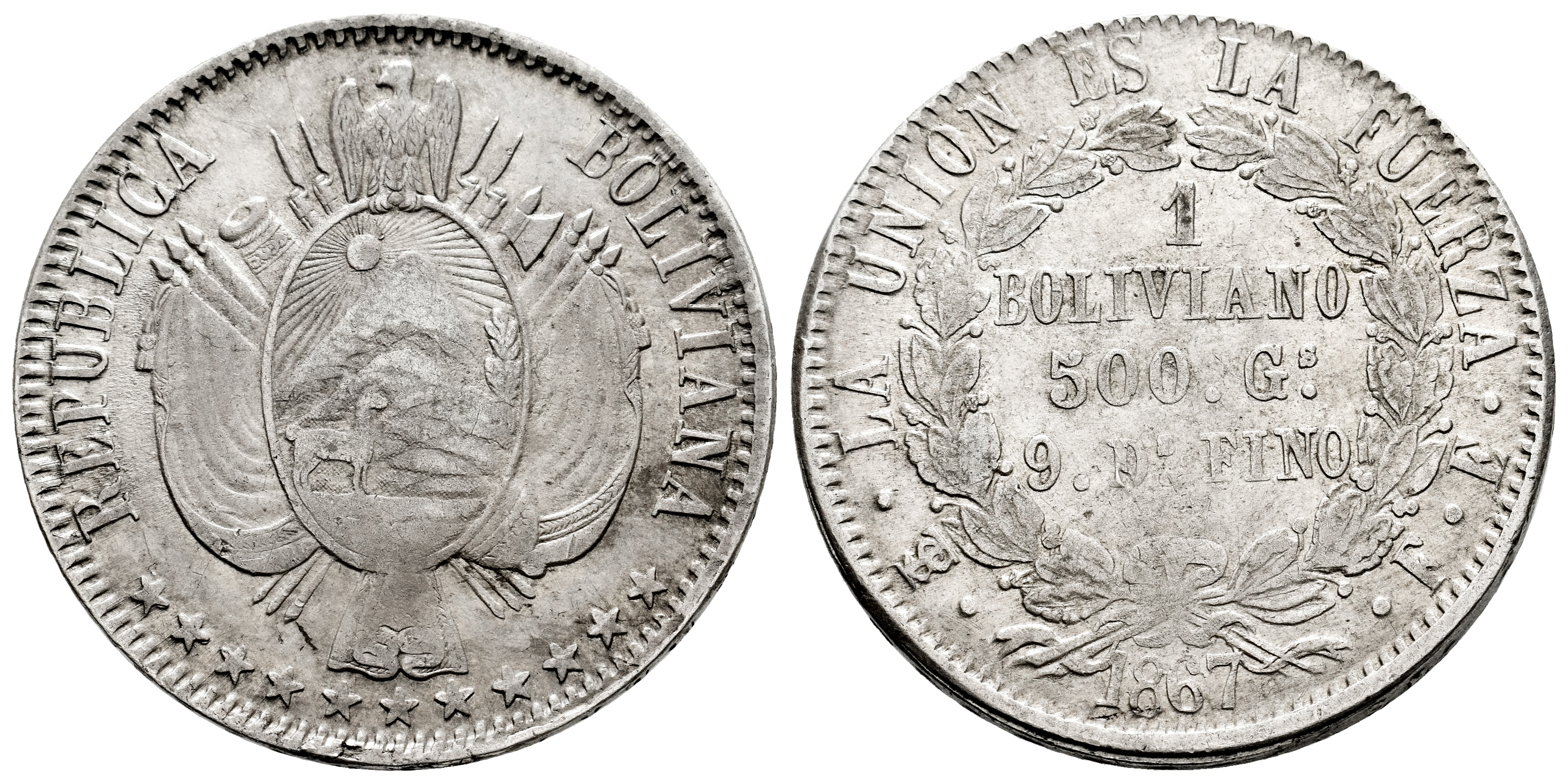 Bolivia. 1 boliviano. 1867. Potosi. FE. (Km-152.2). Ag. 24,93 g. VF/Choice VF. Est...60,00.