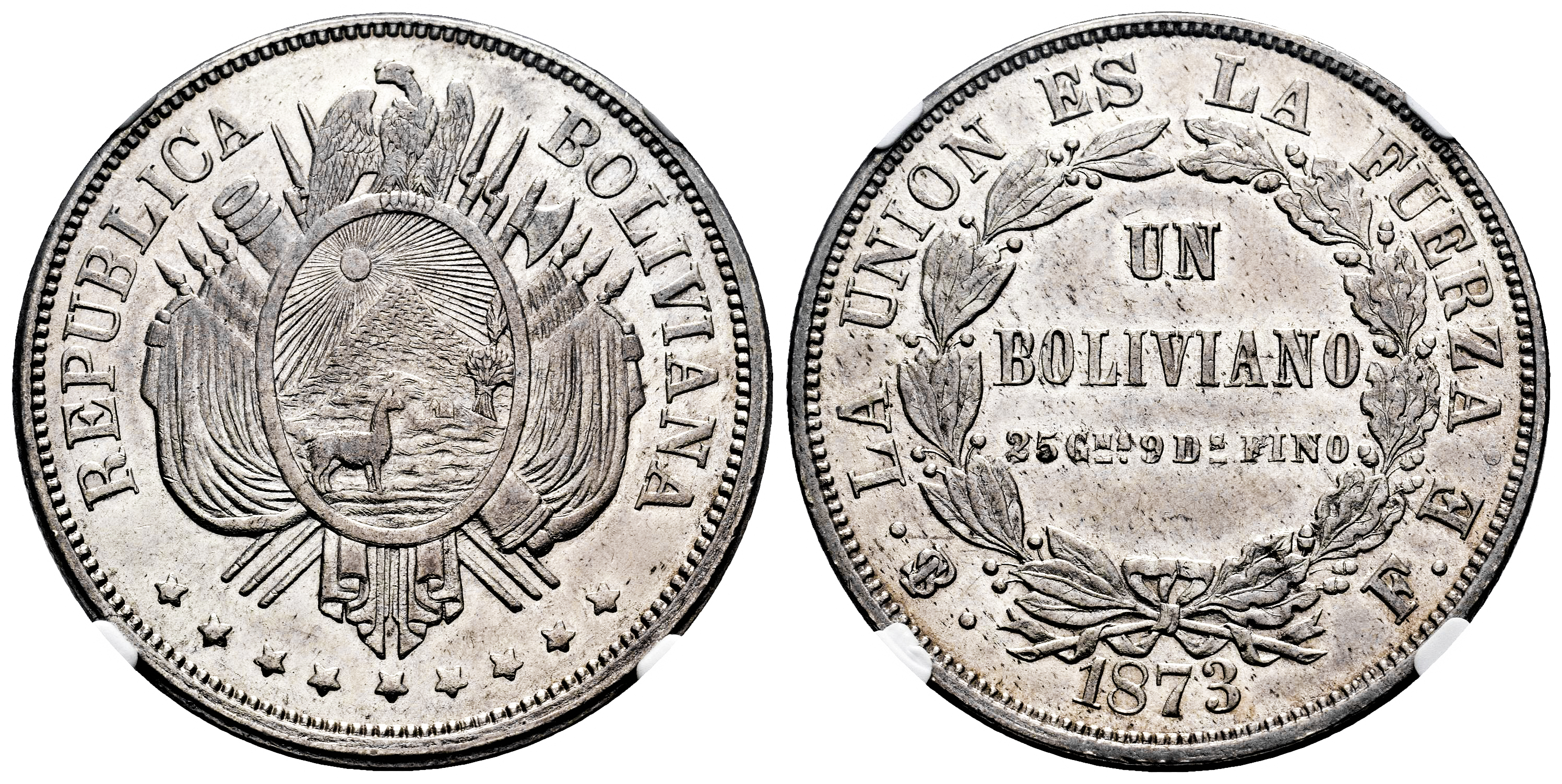 Bolivia. 1 boliviano. 1873. Potosi. FE. (Km-160.1). Ag. Slabbed by NGC as AU 58. Est...120,00.