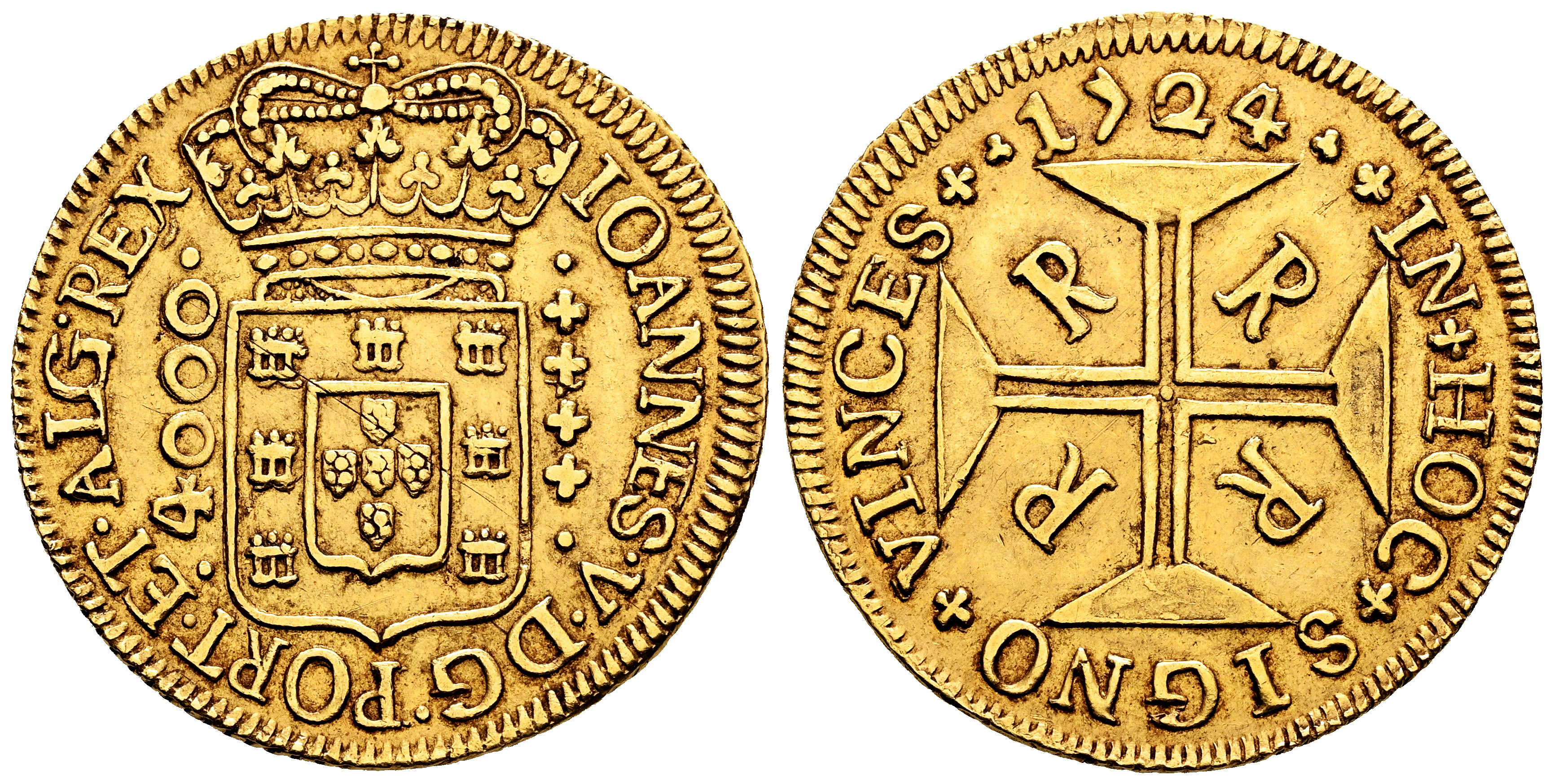 Brazil. D. Joao V (1706-1750). 4000 reis. 1724. Rio de Janeiro. R. (Km-102). (Fried-27). (Gomes-102.32). Au. 10,75 g. Hairline from strike. Nice color. Choice VF. Est...1000,00.