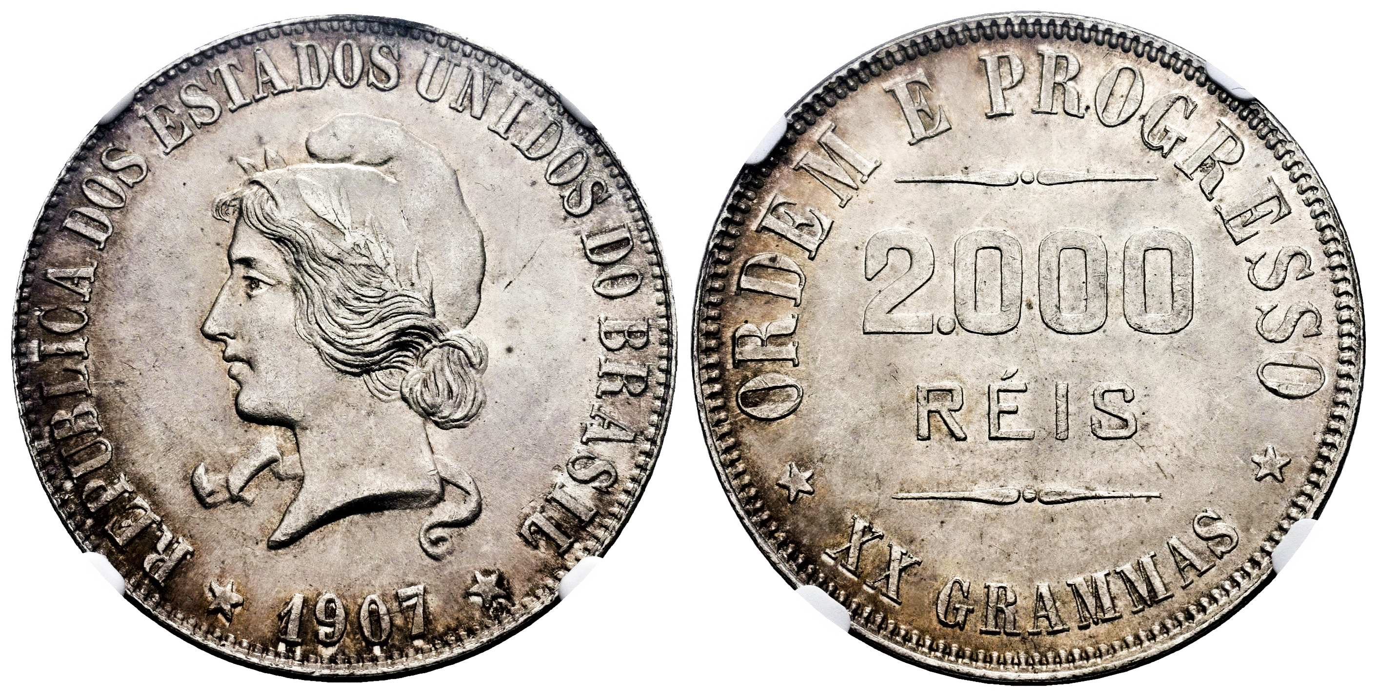 Brazil. 2000 Reis. 1907. Rio de Janeiro. (Km-508). Ag. Original luster. Scarce in this grade. Slabbed by NGC as MS 64. Est...250,00.
