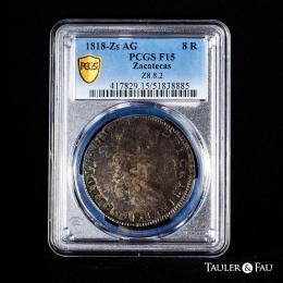 Ferdinand VII (1808-1833). 8 reales. 1818. Zacatecas. AG. (Cal-1459). (Ramírez-Z8.8.2). Ag. Patina. Scarce. Slabbed by PCGS as F 15. Est...200,00.