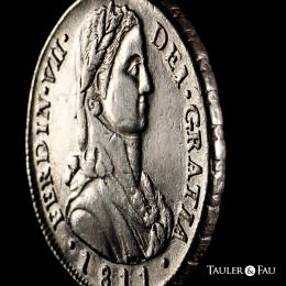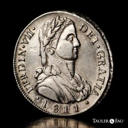 Ferdinand VII (1808-1833). 8 reales. 1811. Santiago. FJ. (Cal-1404). Ag. 26,94 g. Admiral bust. Slight edge rounded. Cleaned. Choice VF. Est...1200,00.