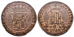 Elizabeth II (1833-1868). 6 quartos. 1837. Barcelona. (Cal-17). Ae. Original luster. Slabbed by PCGS as MS 62 BN. (Top Pop), the finest known in the PCGS census. Est...300,00.