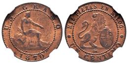 Centenary of the Peseta (1868-1931). Provisional Government (1868-1871). 2 centimos. 1870. Barcelona. OM. (Cal-4). Ae. Original luster. Slabbed by NGC as MS 64 RB. Est...120,00.