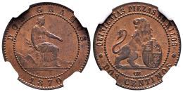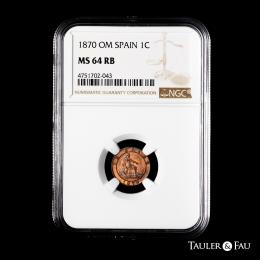 Centenary of the Peseta (1868-1931). Provisional Government (1868-1871). 1 centimo. 1870. Barcelona. OM. (Cal-3). Au. Original luster. Slabbed by NGC as MS 64 RB. Est...100,00.