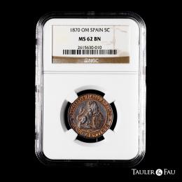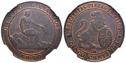 Centenary of the Peseta (1868-1931). Provisional Government (1868-1871). 5 centimos. 1870. Barcelona. OM. (Cal-5). Ae. Traces of luster. Slabbed by NGC as MS 62 BN. Est...150,00.