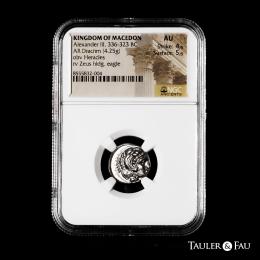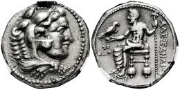 Kingdom of Macedon. Alexander III, "The Great". Drachm. 324/3 BC. Sardes. Struck under Menander. (Price-2571). (Müller-117). (Hgc-3.1, 914e). Anv.: Head of Herakles to right, wearing lion skin headdress. Rev.: Zeus Aëtophoros seated to left, holding sceptre; AΛEΞANΔPOY to right, rose beneath throne. Ag. 4,25 g. Slabbed by NGC as AU, strike 4/5, surface 5/5. Est...250,00.