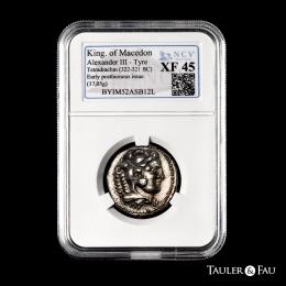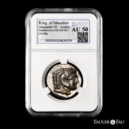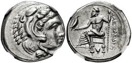 Kingdom of Macedon. Temp. Alexander III – Philip III. Tetradrachm. 327-320 BC. Arados. (Price-3332). (Müller-1370). Anv.: Head of Herakles to right, wearing lion skin headdress. Rev.: Zeus Aëtophoros seated to left, holding sceptre; ΒΑΣΙΛΕΩΣ below, AΛEΞANΔPOY to right, kerykeion in left field, AP monogram under throne. Ag. 14,30 g. Slabbed by NCV as AU 50. Ex Áureo & Calicó 408 ( 19/04/2023), lot 1011. Est...450,00.