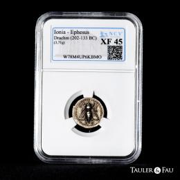 Ionia. Ephesos. Drachm. 202-133 BC. (Sng von Aulock-1846-51). Anv.: Bee with straight wings; E-Φ across fields. Rev.: Stag standing right before palm tree; AYKΣK·Σ to right. Ag. 3,71 g. Well centered. Encapsulada por NCV como XF 45. Almost XF/Choice VF. Est...800,00.