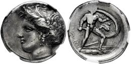 Lokris. Lokris Opuntii. Stater. 369-338 BC. (Sng Cop-43). (Hgc-922). Anv.: Head of Demeter left, wreath with grain ears, wearing triple-pendant earring and beaded necklace. Rev.: ΟΠΟΤΙΩΝ, Ajax the Lesser advancing right in fighting stance, nude but for helmet, sword in right hand, shield in left, inside of shield decorated with griffin leaping right; arrow and spear below. Ag. Slabbed by NGC as Ch VF, Strike 3/5, Surface 4/5. Est...1200,00.