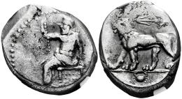 Seleukid Kingdom. Seleukos I Nikator. Stater. 311-305 BC. (SC-88.4). Anv.: Ba'al seated left on backless throne, grounded scepter in right hand, left hand on throne. Rev.: Lion advancing left; horizontal anchor above, crab seen from above in exergue. Ag. Slabbed by NGC as Ch F, strike 3/5, surface 3/5. Est...500,00.