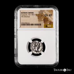 Caracalla. Denarius. 210-213 AD. Rome. (Ric-IV 216). (Bmcre-77). (Rsc-123). Anv.: ANTONINVS PIVS AVG BRIT, laureate head to right. Rev.: LIBERALITAS AVG VI, Liberalitas standing to left, holding abacus and cornucopiae. Ag. 2,78 g. Slabbed by NGC as Ch XF. Est...100,00.